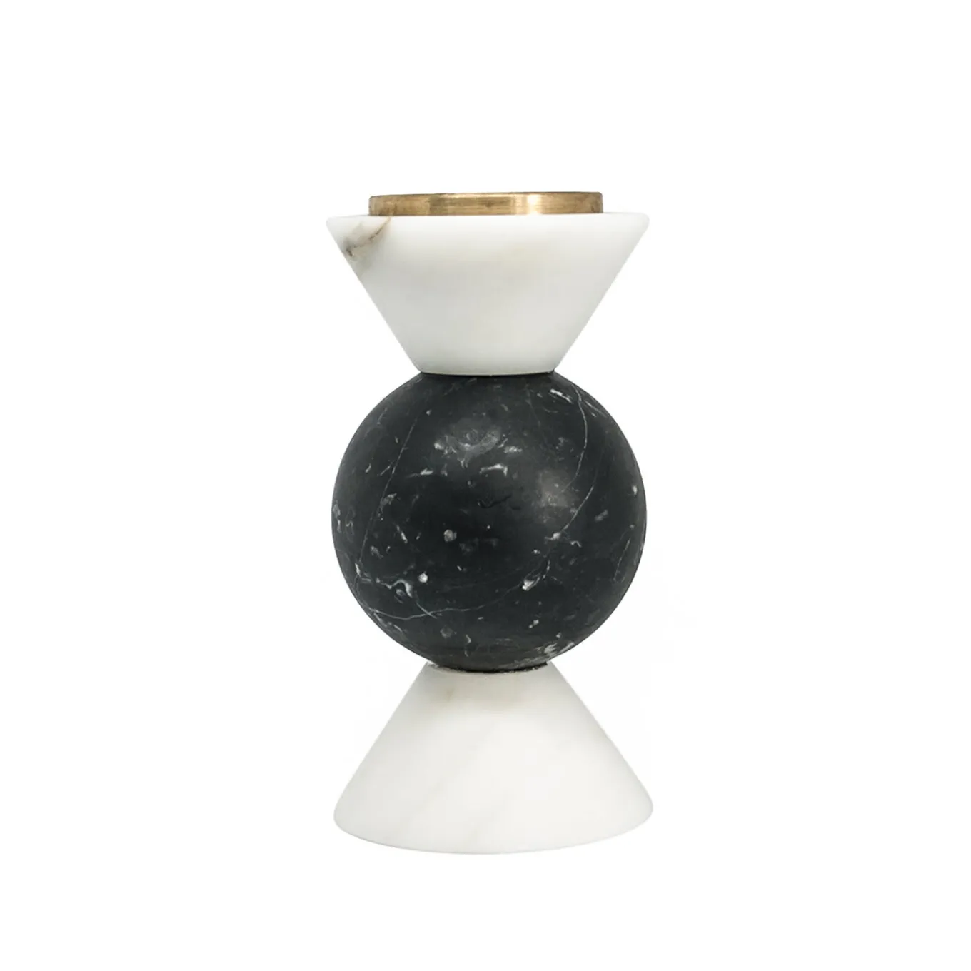 This two-toned candleholder features alternating, geometrically shaped pieces of black Nero Marquina and White Carrara marble. Its top is rimmed in bronze. Handcrafted by Italian artisans using traditional techniques, this pieces is perfect as an accent in the home, as a gift or for use at a wedding. The material’s unique veining makes each piece a one-of-a-kind.