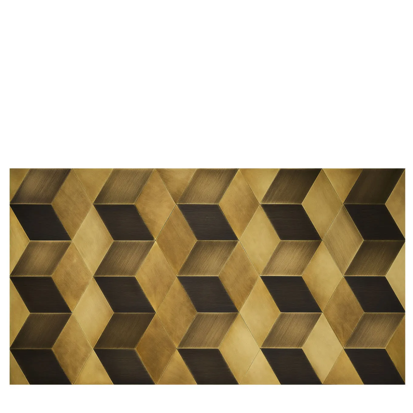 The hypnotizing charm of three-dimensional geometry meets the elegance of metallic surfaces in this stunning set counting 15 burnished brass tiles. An intriguing interplay of lights and shadows maximizes the illusion’s visual impact while creating the conditions for a triumph of differentiated sheens changing with light exposure. The price listed is for the set of 15 tiles. Product images show the different compositions that can be made. Contact the concierge for more information and details.