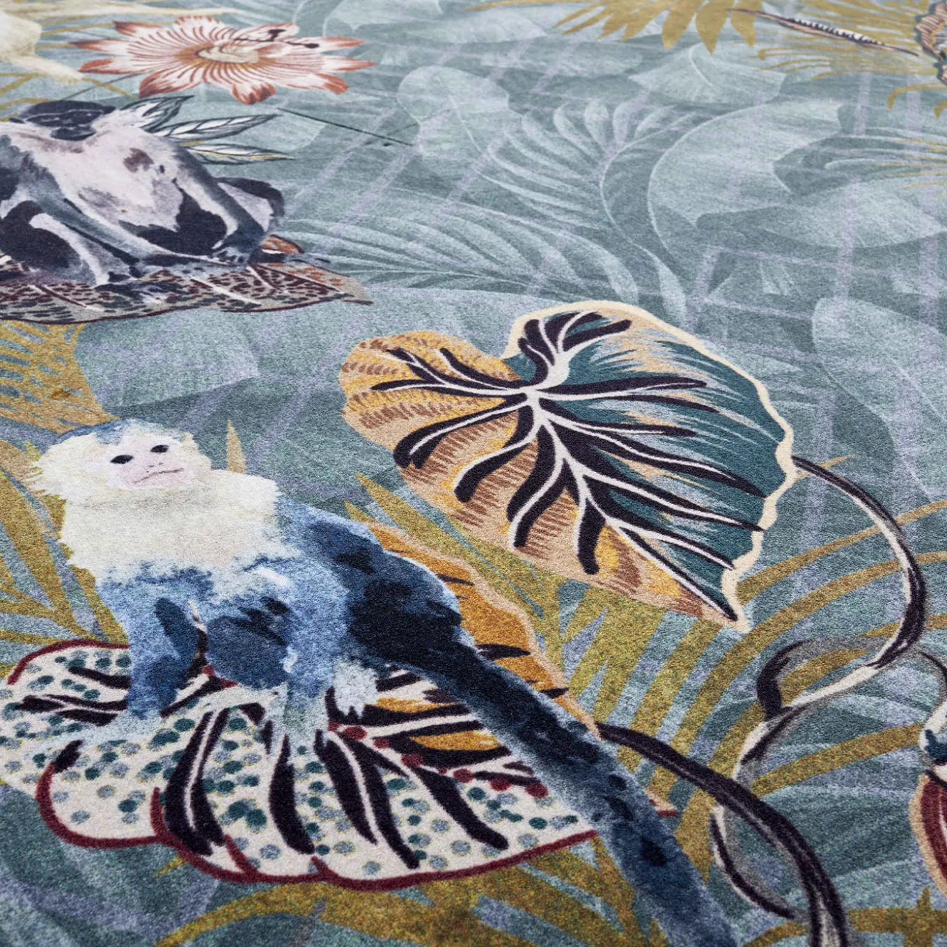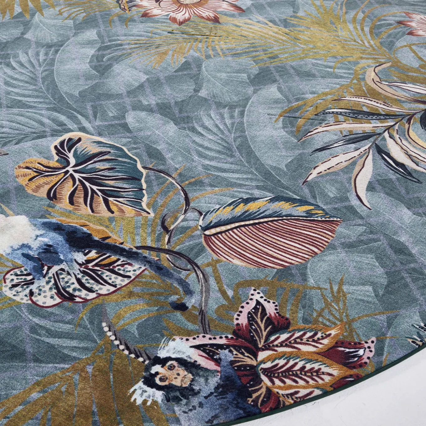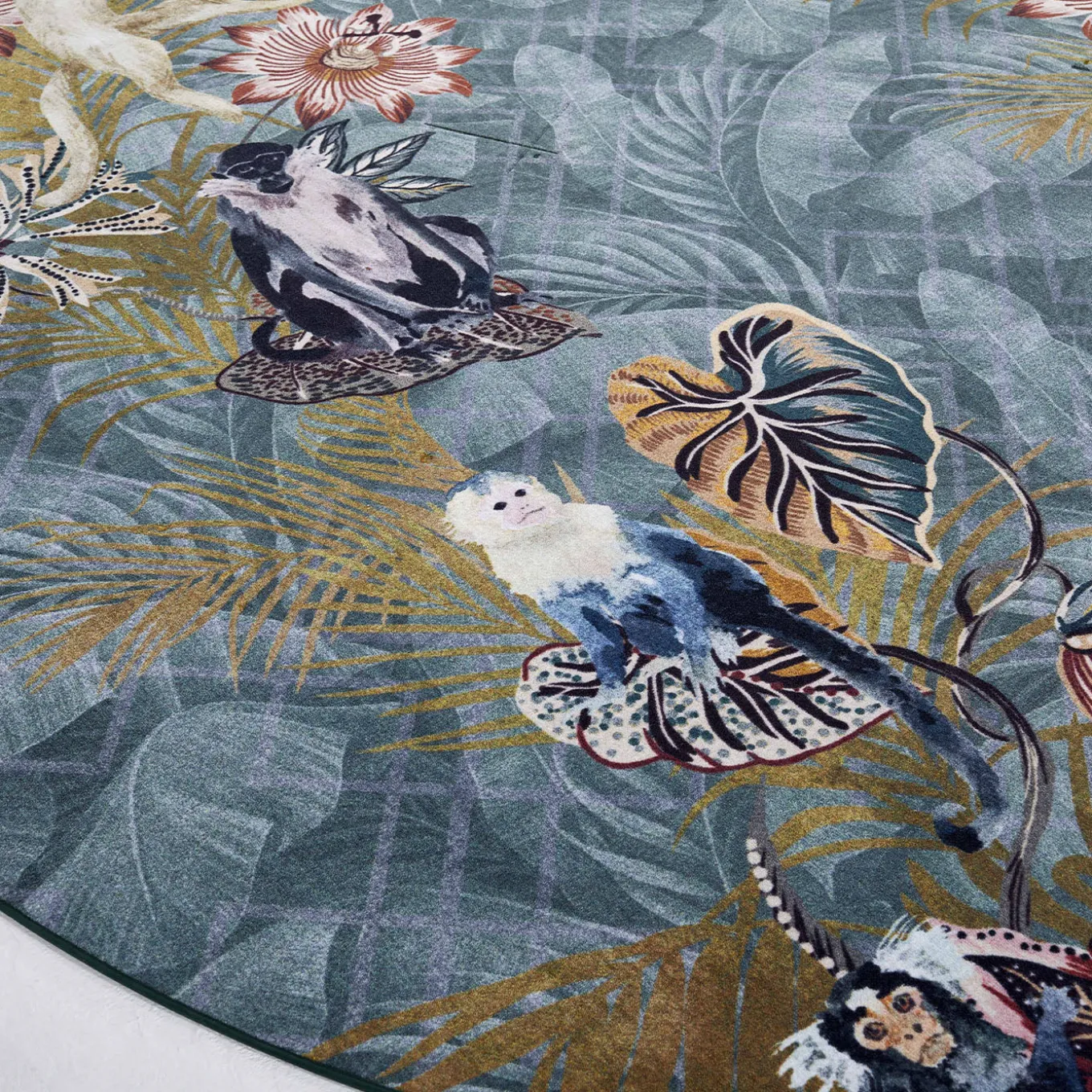 The Lucien Jungle rug features a dynamic geometric background layered with tropical leaves and colorful monkeys in playful poses. Bright hues and bold patterns enliven any space with energy and a sense of whimsy. This round rug is designed to transform interiors with distinctive character, ideal for those seeking to add a lively and imaginative accent to their decor.