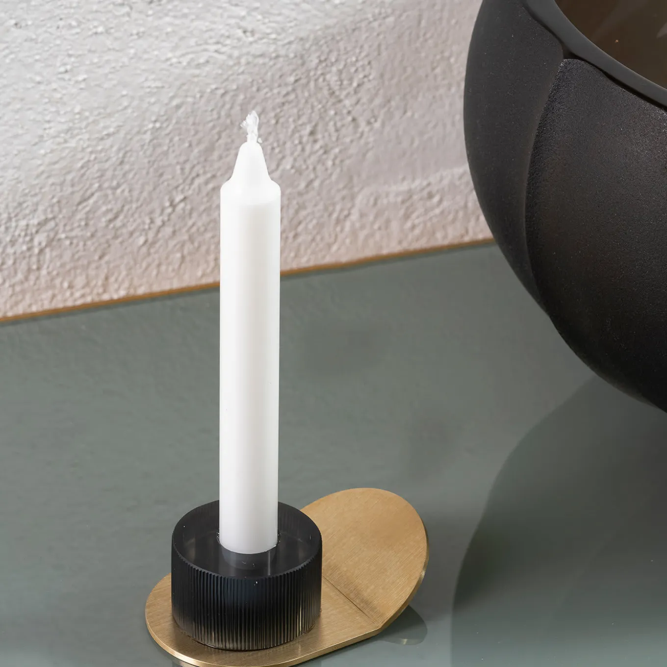 A small Murano glass candle holder resting on a satin brass tray, the Lumino Stripe, here in Steel Gray and Crystal, features a clear upper glass surface which allows for a view of the murrina glass rods, while the lateral surface is engraved vertically with stripes. The oblong tray has an inclined end which is convenient for holding the candle.