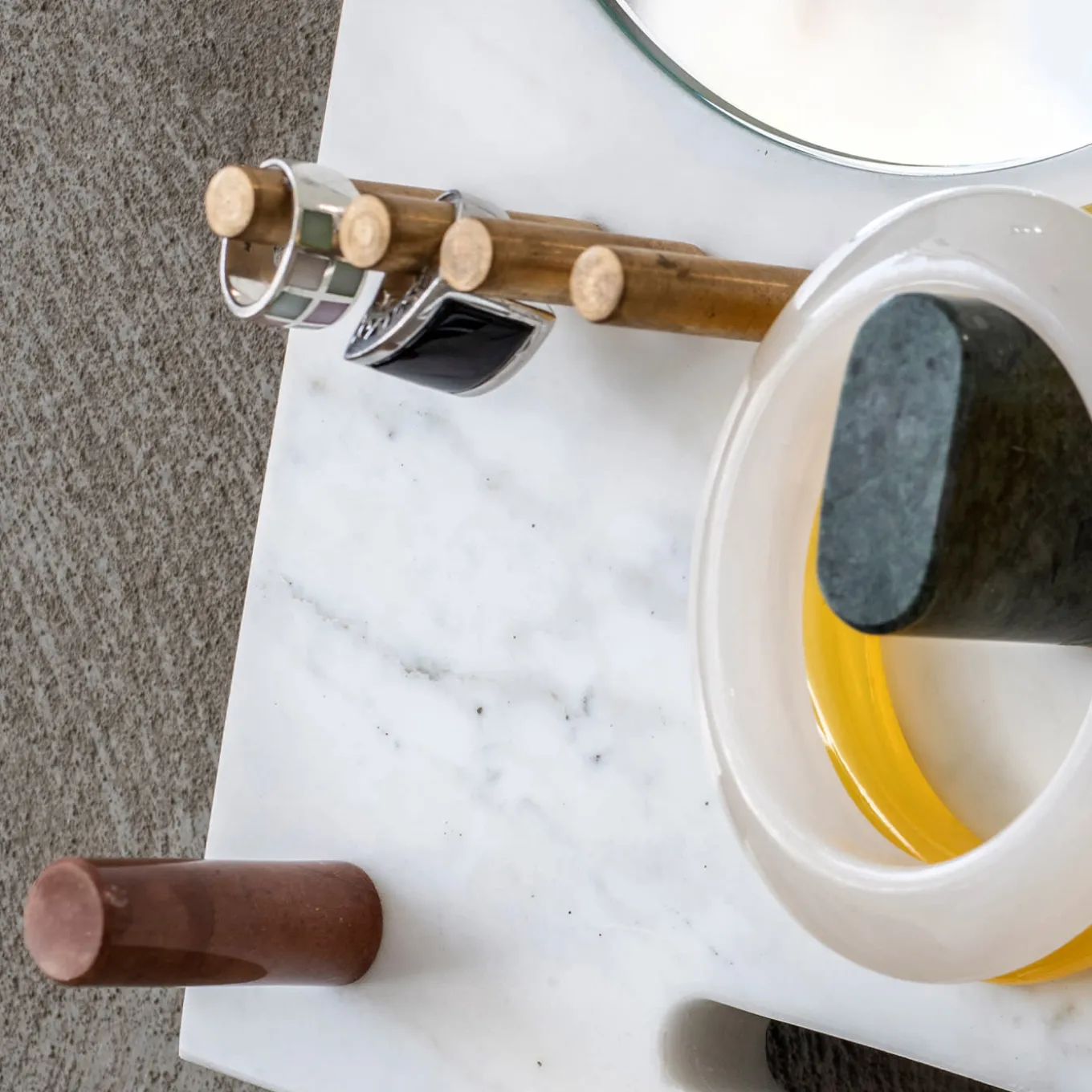 A superb complement to luxe contemporary bedroom or bathroom decors, this jewelry stand reveals its graceful appeal through clean geometric lines and a mixture of polychrome marbles. The frame in white Carrara marble is marked by rounded and streamlined contours and hooks in different sizes and styles perfect for displaying necklaces or bracelets. The incorporated circular mirror allows one to take a glance while assembling a night or daytime look.