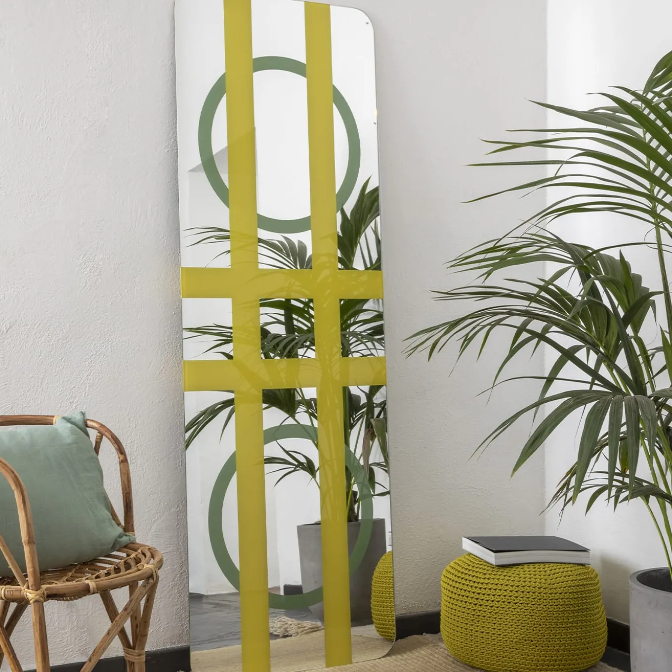 This mirror features extra clear glass with a unique lacquered design in multiple colors, presenting a striking interplay of geometric shapes including circles and intersecting lines. Part of the MURALES series, it replaces traditional masonry with colored transparent surfaces that integrate sandblasted and lacquered motifs to creatively fragment reflections. This piece is customizable in size and color to suit various interior styles, combining artistic expression with functional design. For further information please contact the Concierge.