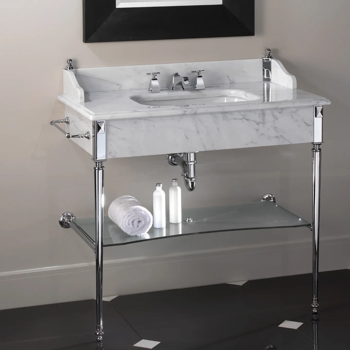 Being inspired by the English design of the late 19th century, this console is a small masterpiece of formal harmony. High-quality materials: precious white Carrara, black Marquinha or Calacatta Borghini marble for the top and raised back, turned brass for legs and towel rail. Also available in other finishes, please contact the concierge for more options. Faucets are not included.