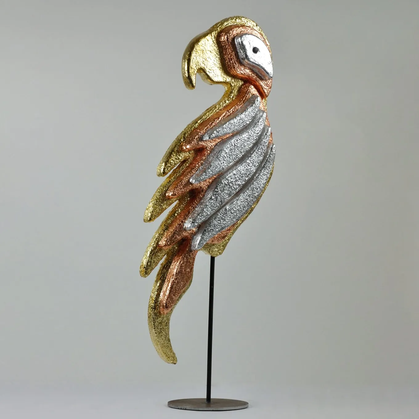 Evoking exotic atmospheres, this zoomorphic sculpture in the shape of a multicolor parrot is a deft showcase of craftsmanship enriched with a combination of silver, gold, and copper leaf that lend it its alluring shimmering quality. Crafted from extruded polyurethane, the parrot stands on a streamlined and minimalist base in raw iron, its special textured look achieved thanks to the application of plaster on relief.