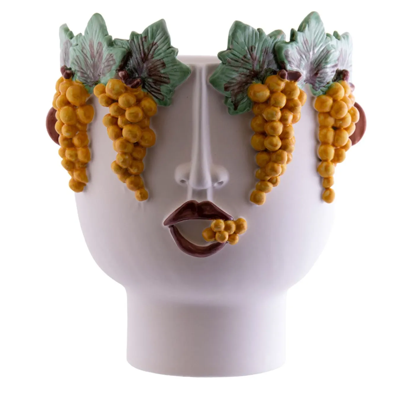 The second fire-fired ceramic head, handmade with face and white grapes reliefs, can be used to hold plants, flowers and sometimes even bottles with ice. Malvasia sells White grapes at the Palermo market, a beautiful and amazing woman!