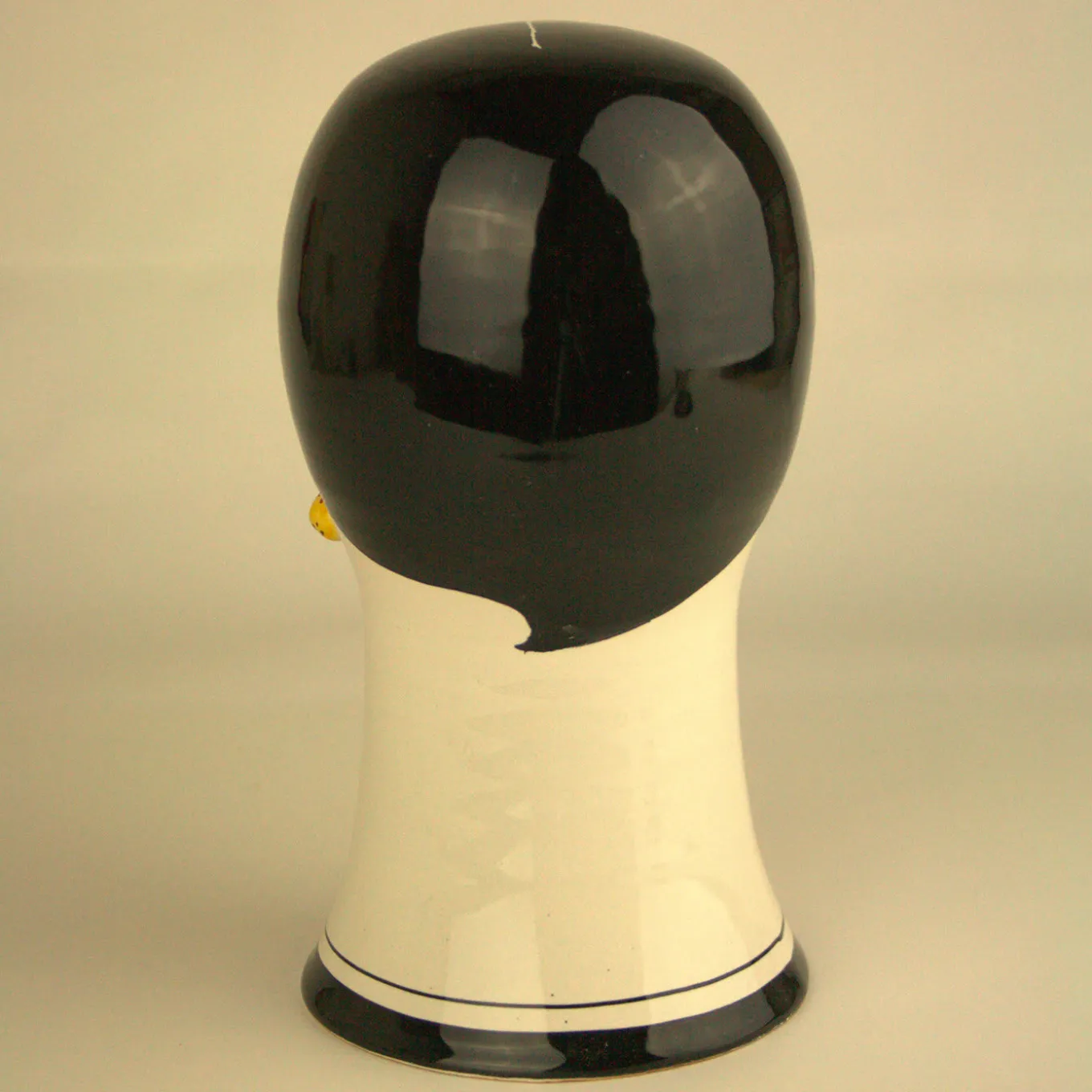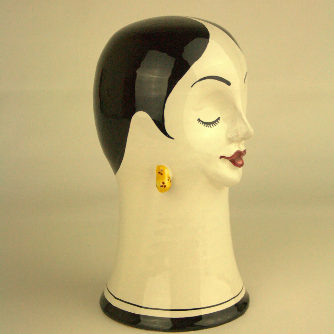This elegant sculpture is part of a series of decorative pieces made of ceramic on the lathe and entirely decorated by hand. The sculpture of a woman is marked by an elongated neck marked at the base with two black lines, closed eyes and elegant features depicted in an interpretive fashion. The woman’s visage is enhanced by her coiffure, the hair neatly parted to reveal two yellow earrings that highlight her red lips. A veritable work of art, this object can be displayed alone or with similar pieces from the same series to enliven any room in a modern or eclectic interior.