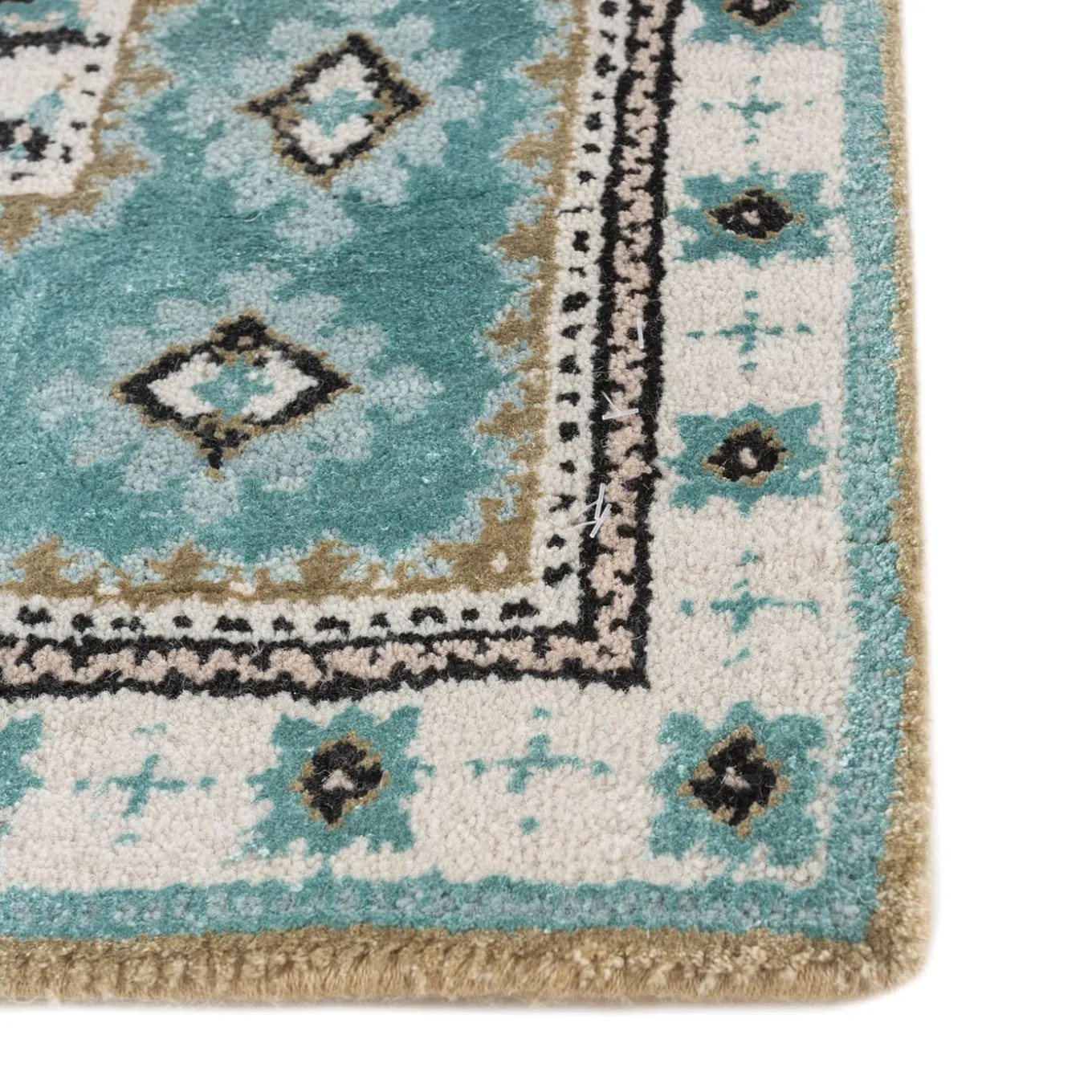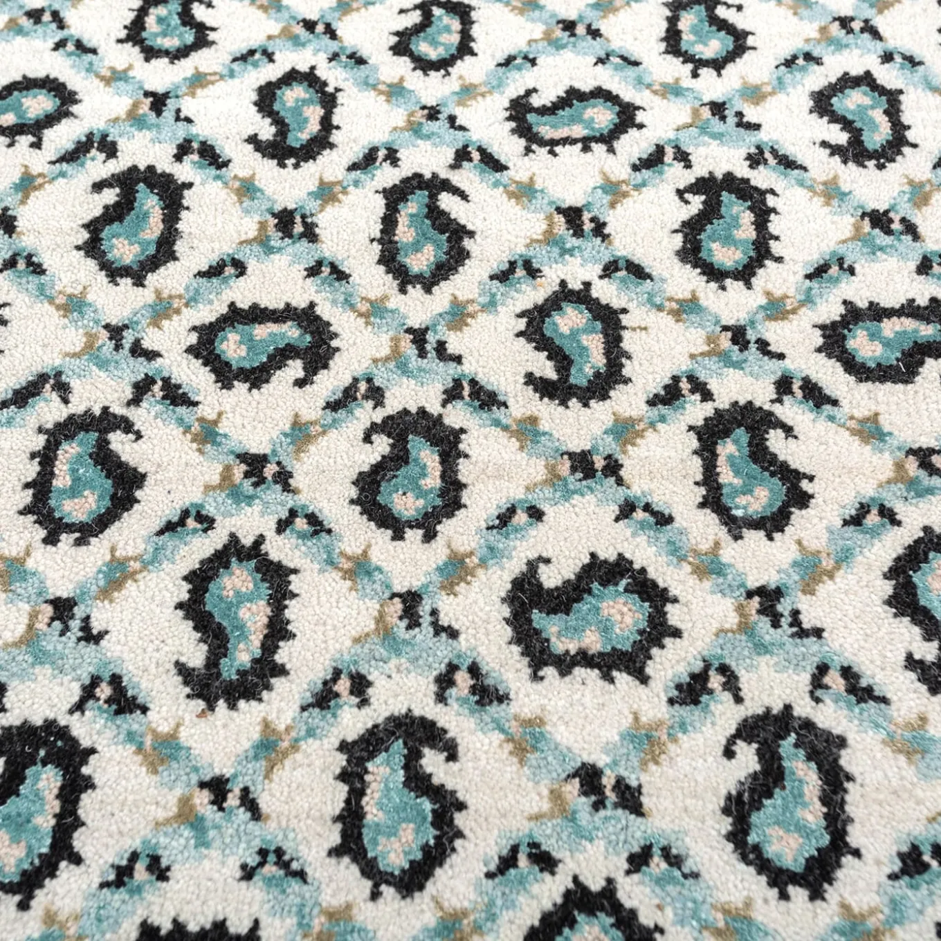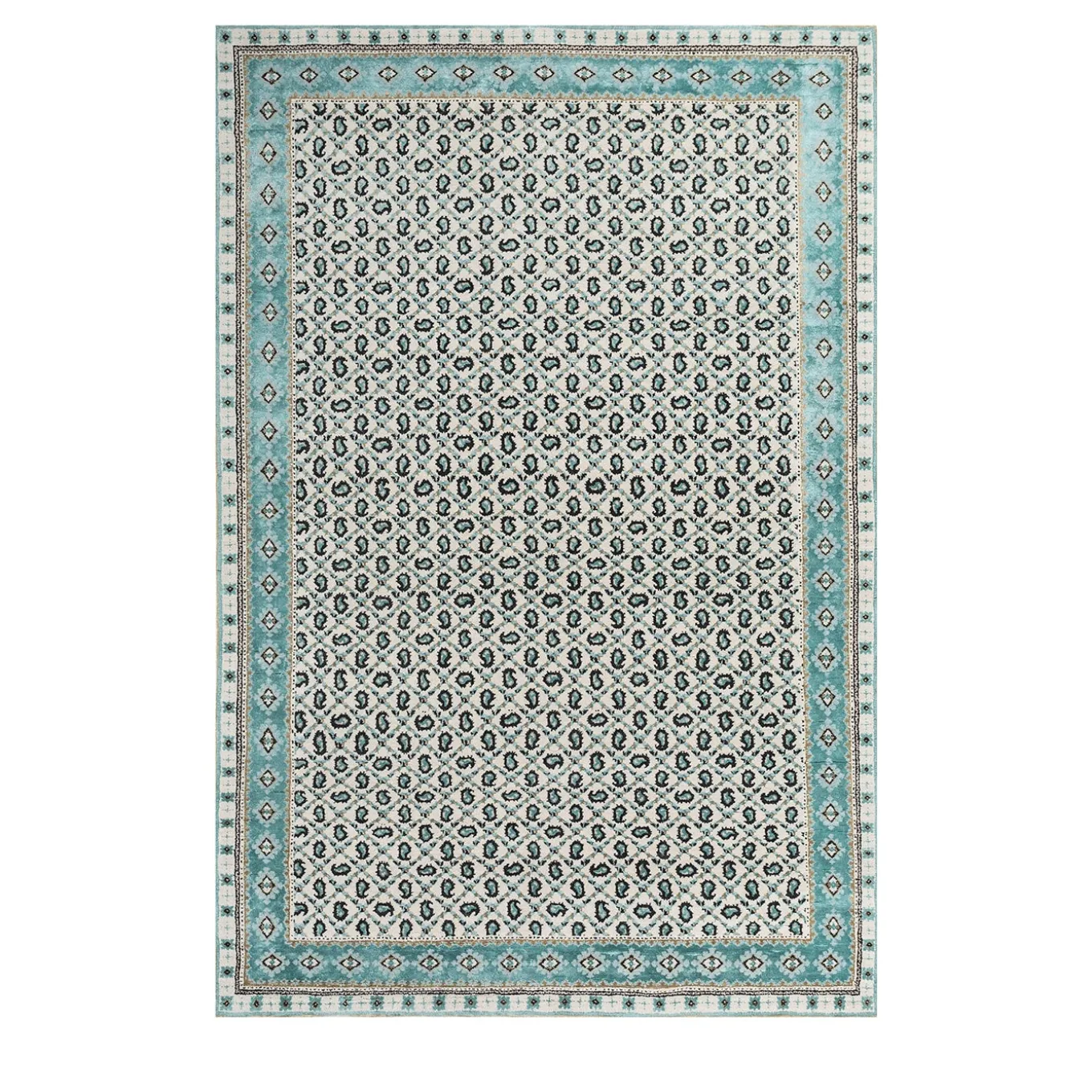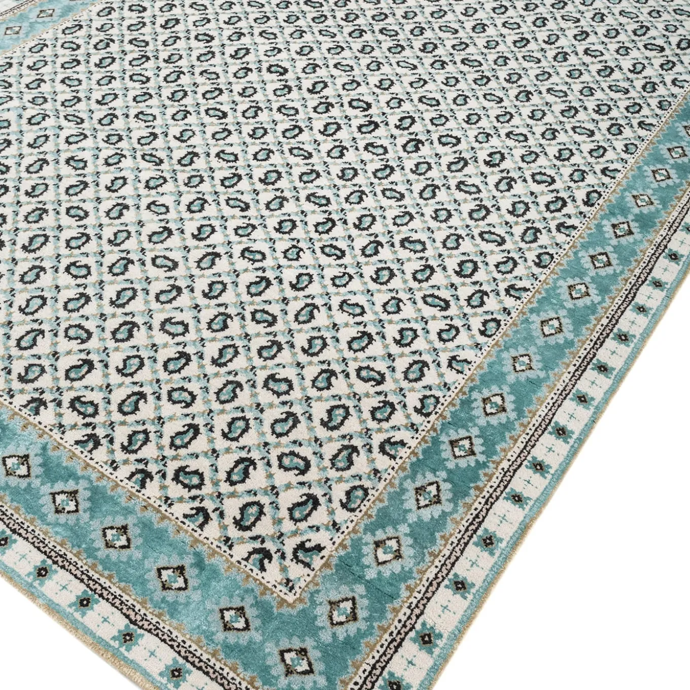 Experience the exquisite craftsmanship of the Marcellin Hand-Knotted Rug, where vintage charm meets contemporary elegance. Inspired by the daring designs of French decorator Madeleine Castaing, this luxurious rug showcases her signature style through intricate stylized paisley motifs set within a decorative trellis. A classic ornamental geometric border elegantly frames the design, enhancing the visual allure. Crafted from a sumptuous blend of wool and bamboo silk, this rug features a vintage and distressed look in striking tones of white and pool blue. The bold patterns and rich colors evoke a sense of sophistication, making it a stunning centerpiece suitable for diverse interior styles. Meticulously hand-knotted in Rural India, it’s a testament to modern craftsmanship, beautifully paralleling the artistic vision of one of France’s greatest design pioneers.