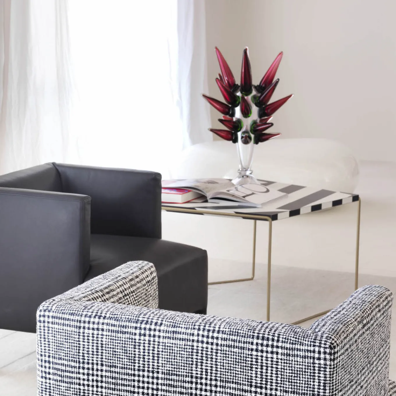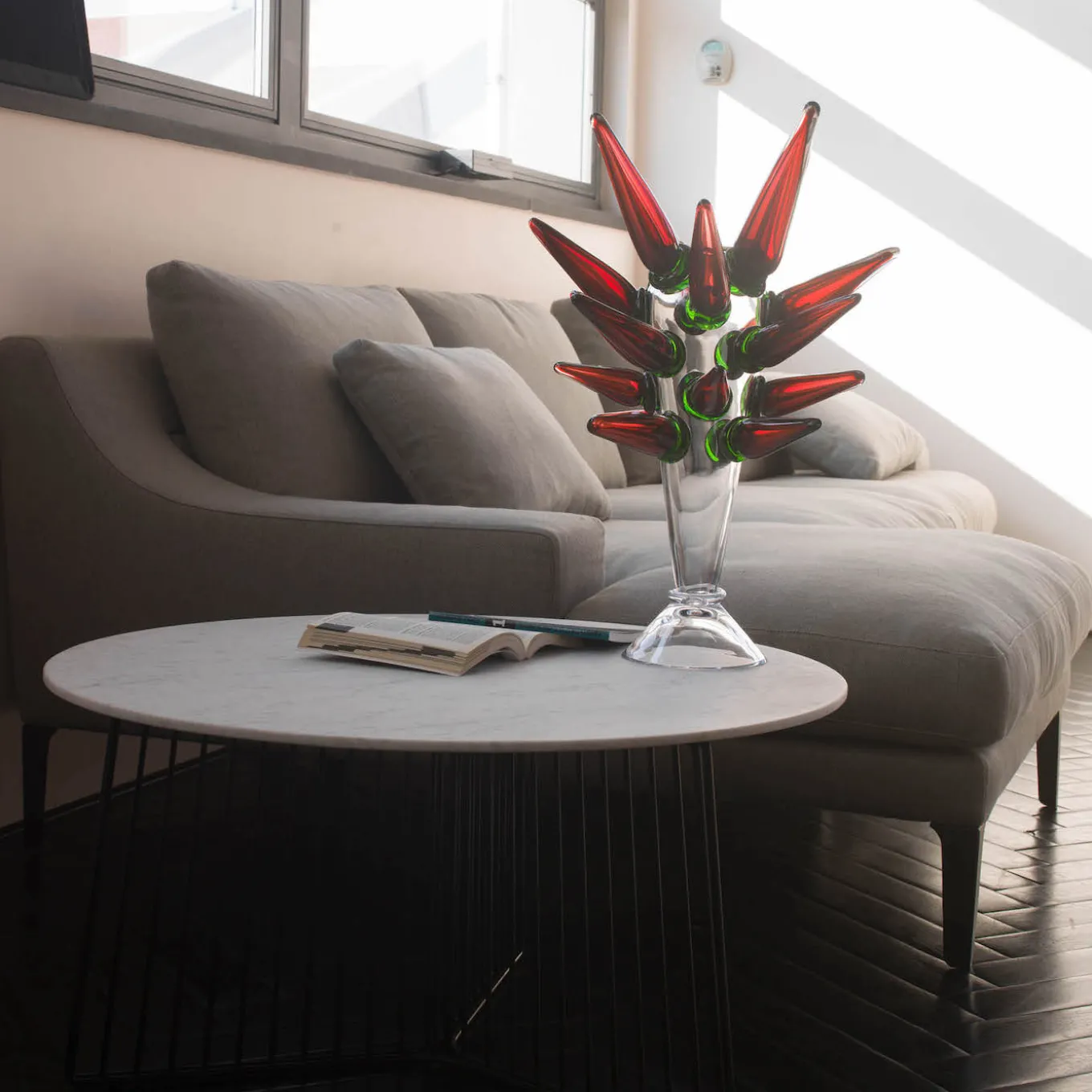 An eccentric design distinguished by thorn-like protuberances in green and red mark this precious glass vase. Brimming with sculptural allure, it is sure to catalyze attention wherever it is placed, thanks to its interplays of dramatic volumes, transparencies, and generous dimensions. A conical base completes this singular glass masterpiece designed by Borek Sipek.