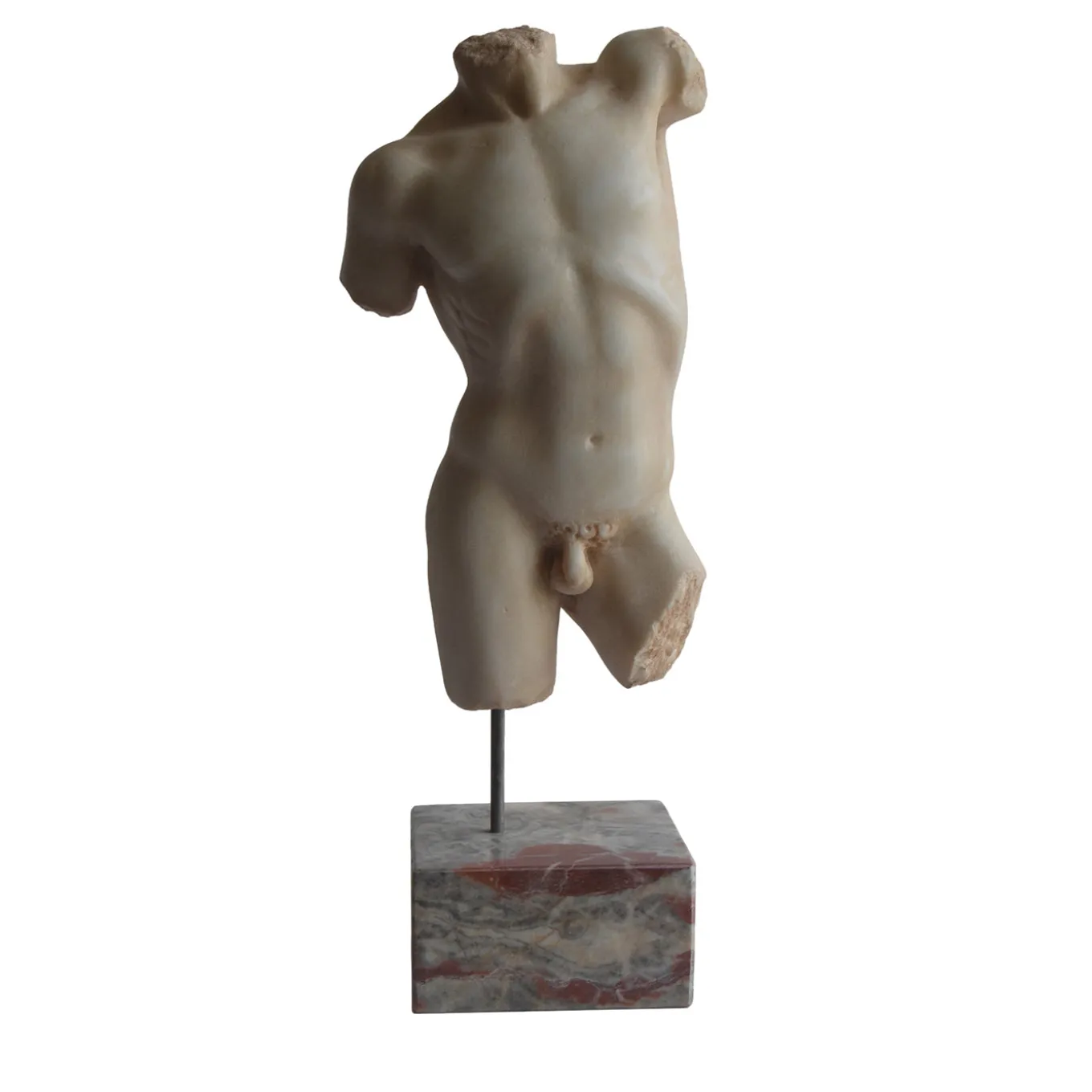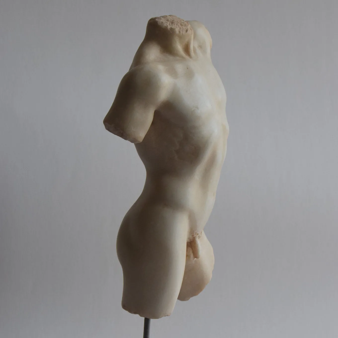 A medium-sized male torso sculpture sculpted from pristine white Carrara marble rests on a marble base. Standing 33.5 cm tall and weighing 3.5 kg, this piece features an antiqued finish with special patinas to evoke the appearance of original museum models. Crafted in the certified Todini laboratory in the Lazio region, recognized for its cultural and aesthetic value, the sculpture embodies classical elegance and refined craftsmanship. One-of-a-kind piece.