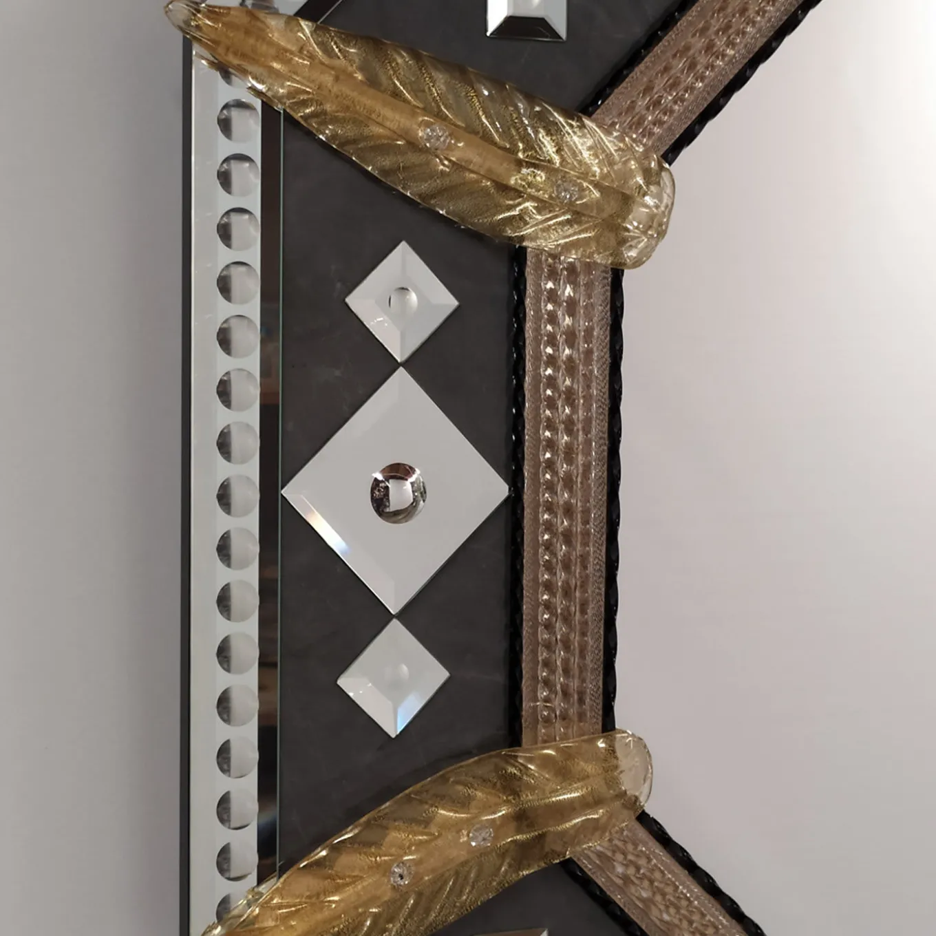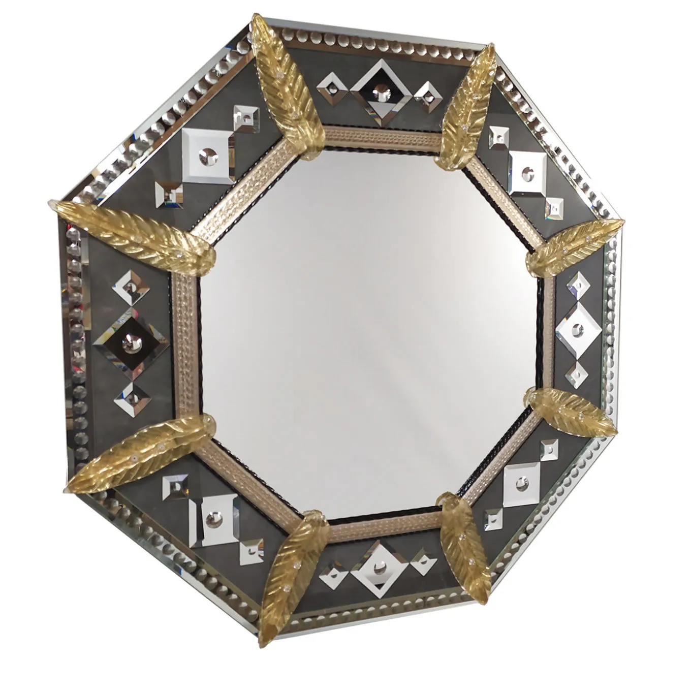 Named after Greek God Mars (“Marte” in Italian), this splendid wall mirror is distinguished by a clean and angular octagonal frame of bold visual impact. Fashioned of gray marble, the central body of the frame is enriched with square-shaped mirror details and bubbly accents deftly engraved and polished by hand. The inner part of the frame is handmade of Murano glass in gold and black tones, and the whole piece is decorated with gold-colored Murano glass leaves.