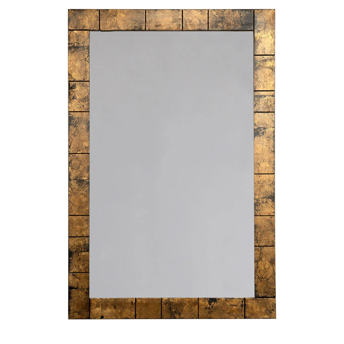 Brimming with regal allure, this rectangular wooden wall mirror features a neat and harmonious geometric design ennobled by a precious bronze-leaf finish against a black backdrop. Its rigorous elegance unmistakably reflects its contemporary inspiration, a trait reinforced by linear grooves subtly enlivening the frame.