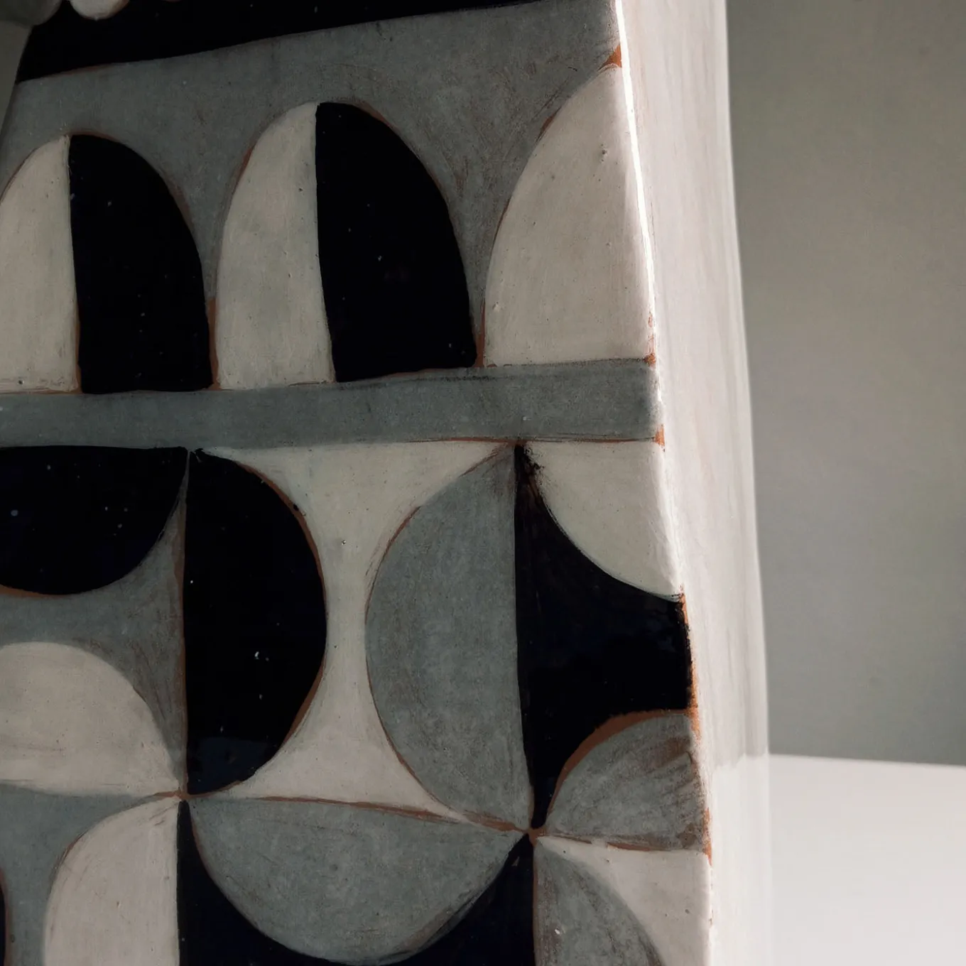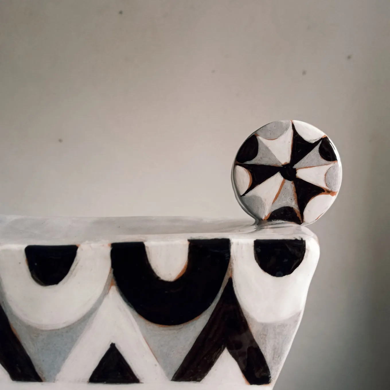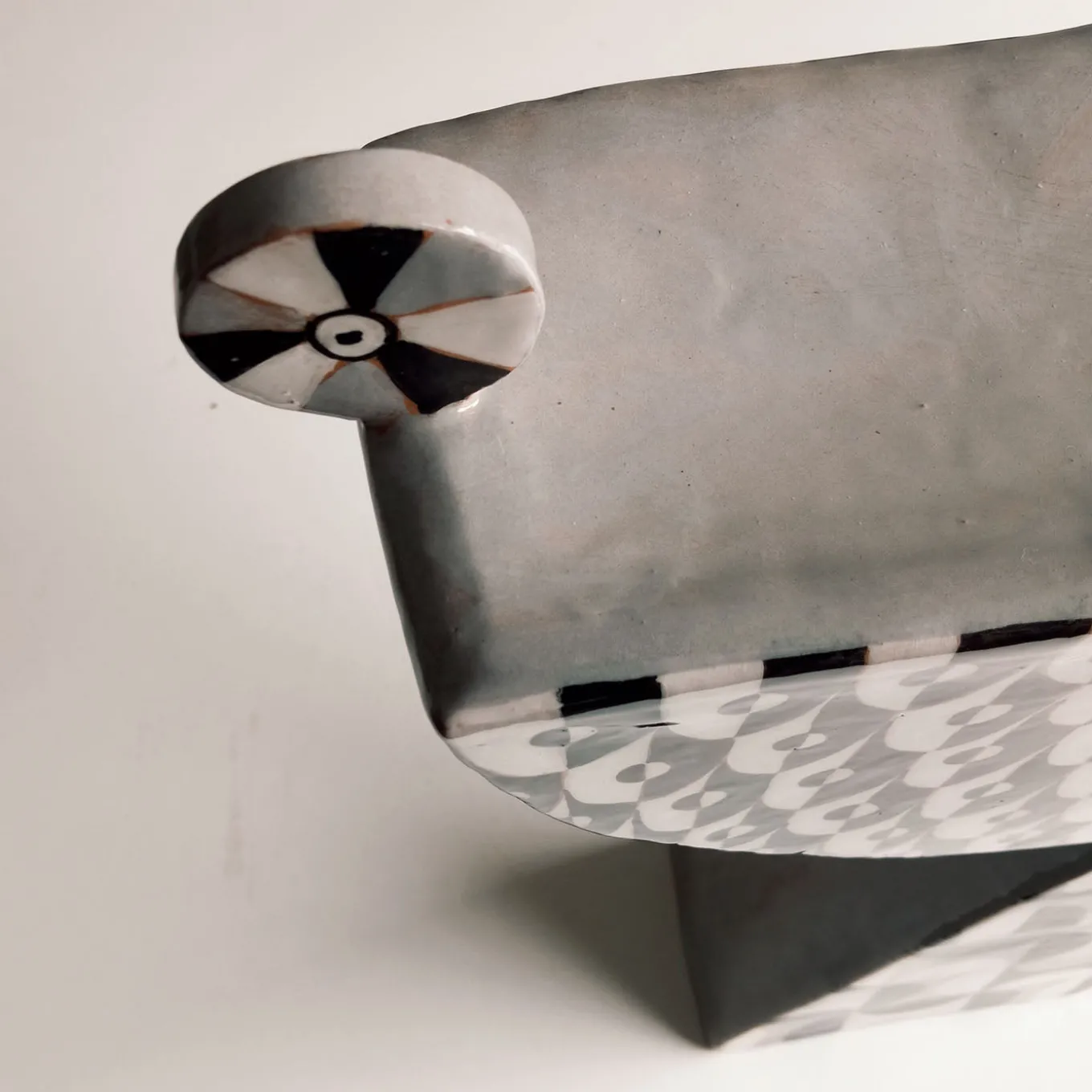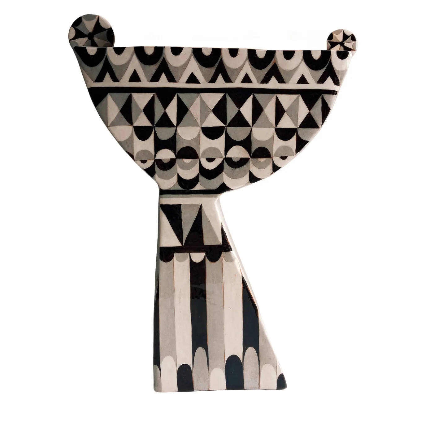 This large alzata features a Bauhaus-inspired geometric decoration in contrasting tones of white, black, and gray. Crafted with a minimal thickness, it is suitable for display even on limited surfaces. The piece is created from flat slabs, allowing the distinctive bidimensional design to stand out clearly. Its substantial size and striking pattern make it ideal for showcasing citrus fruits or serving as an artistic focal point. Each piece is unique and may feature slight variations due to its handmade nature.