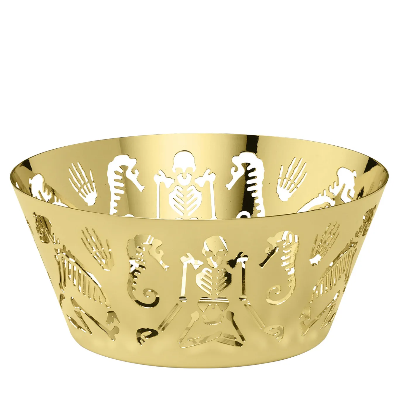 Part of the Perished collection, this piece of functional decor was made in steel and its classic conic shape is reinterpreted using contemporary sensibility, thanks to the openwork decorations that adorn its sides featuring stylized skeletons and bones. Playful modern, this piece combines impeccable craftsmanship with modern charm and will make a statement as a bowl or centerpiece.