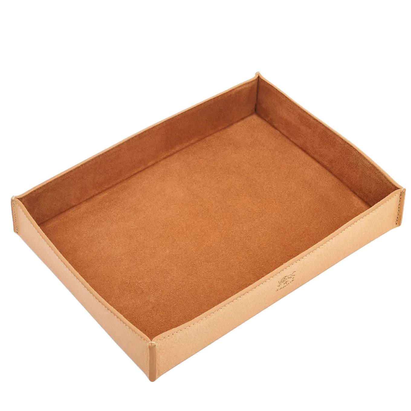 Eye-catching in its structured design, this medium valet tray in natural leather offers both elegance and practicality. Its spacious size accommodates larger items effortlessly, making it ideal for organizing desk essentials or keeping personal belongings in order. Hand-stitched corners and a suede lining highlight its refined craftsmanship. Crafted in Tuscany from premium vegetable-tanned leather, it showcases Il Bisonte’s signature style and the exceptional artisan skill.