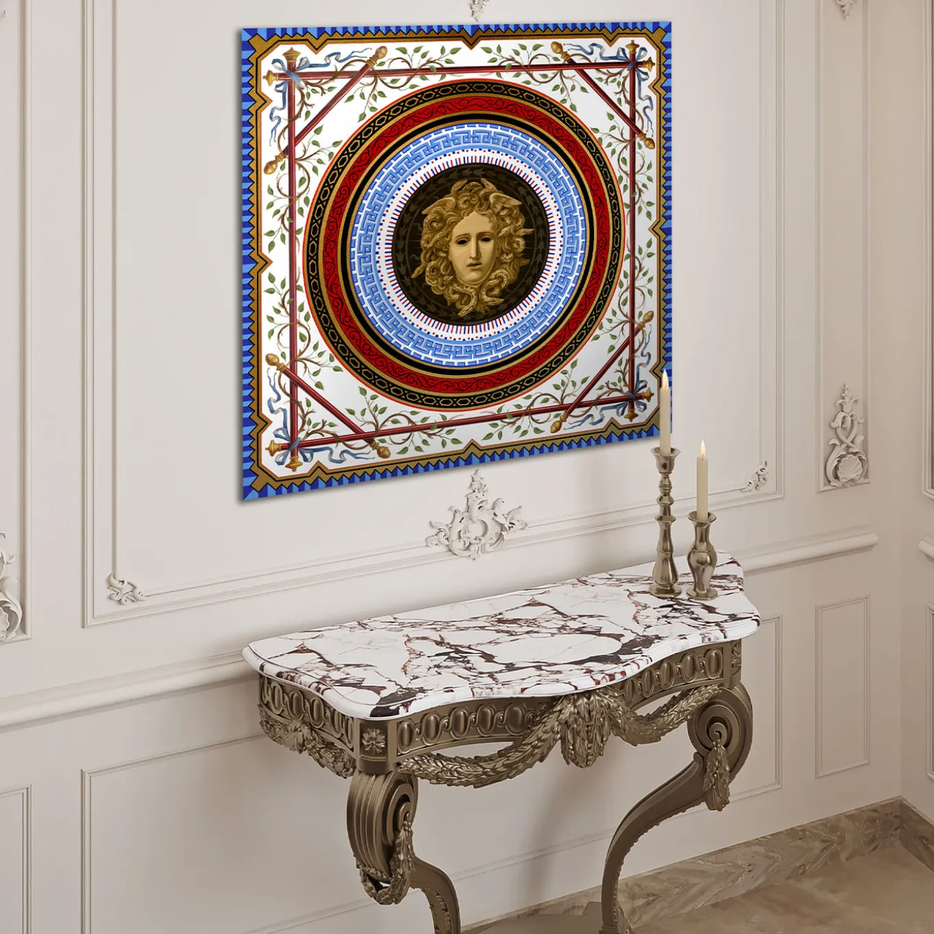 A mesmerizing depiction of Medusa, this panel merges mythology with refined craftsmanship. The intricate details of her face are enriched with hand-applied gold powder, giving an ethereal glow. A raised relief technique adds depth, making the figure almost lifelike. The glossy finish enhances the dramatic contrast, making this artwork a bold and timeless statement piece for any interior.