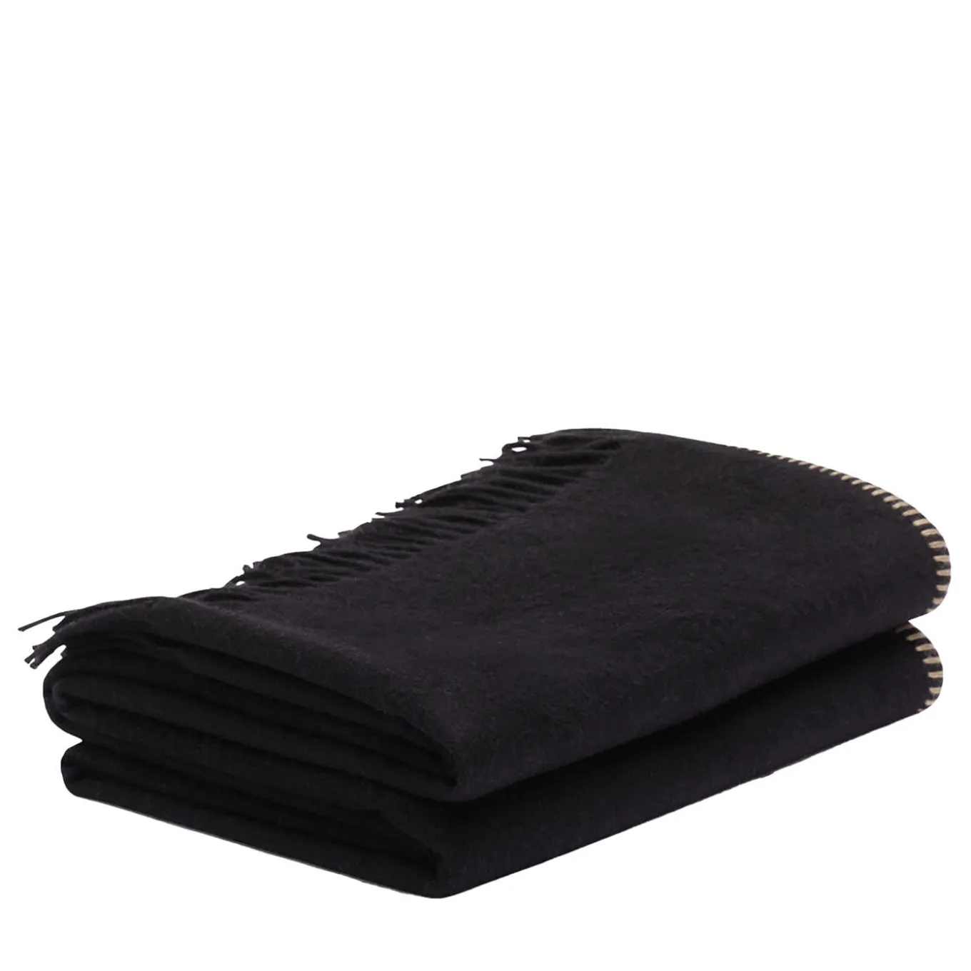 Crafted of fine cashmere, this black small blanket distills a sense of quiet elegance with its plain design only enlivened by color-contrasting, hand-sewn stitches and fringed details. The double-sided design and the selection of soft and lightweight yarn make the piece a precious addition to beds or sofas. Multiple color variants are available in the Artemest catalog.