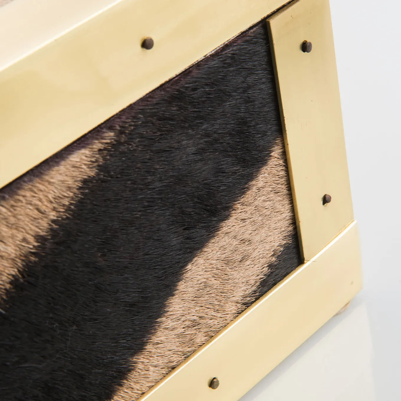 The box is crafted with genuine zebra hide, showcasing the animal’s distinctive and iconic stripes. The hide is carefully selected and expertly applied to the box, ensuring both beauty and durability. A frame of protected natural brass surrounds the zebra hide, adding a touch of classic elegance.