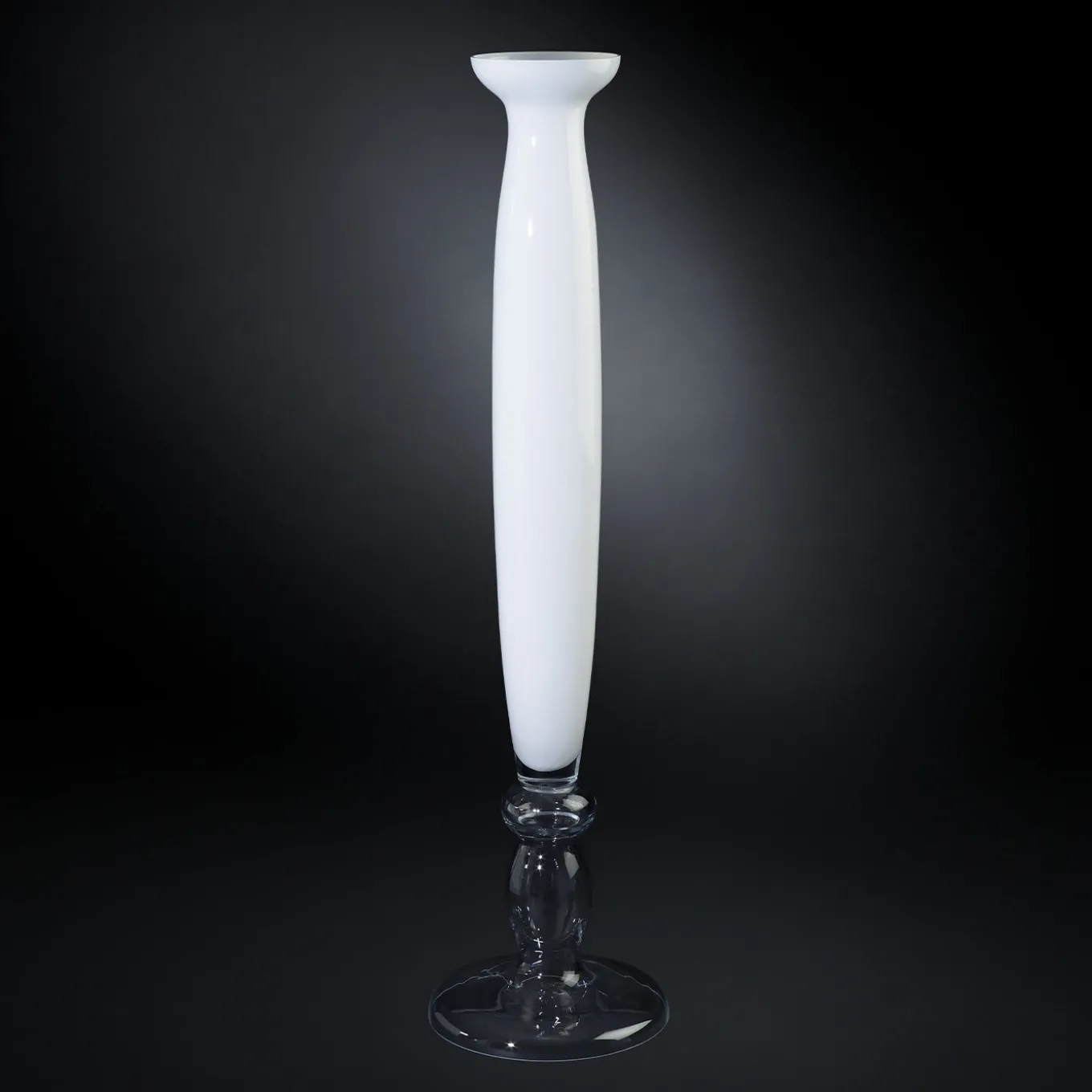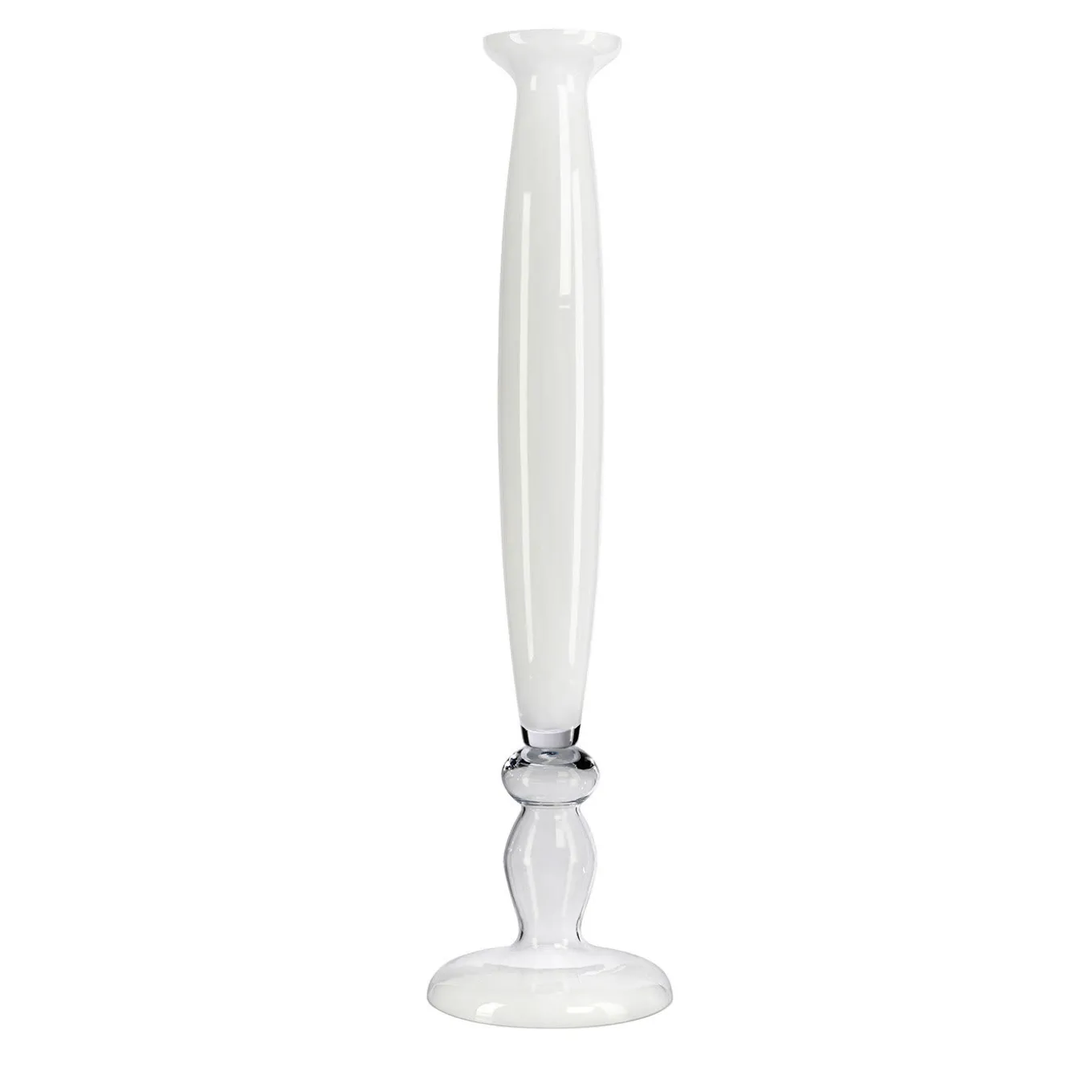 This precious vase will make a charming addition to an entryway or modern living room. Handcrafted by expert artisans using traditional glassmaking techniques, it boasts a smooth and polished slender silhouette that combines a clear glass base with a white glass body for a timeless aesthetic.