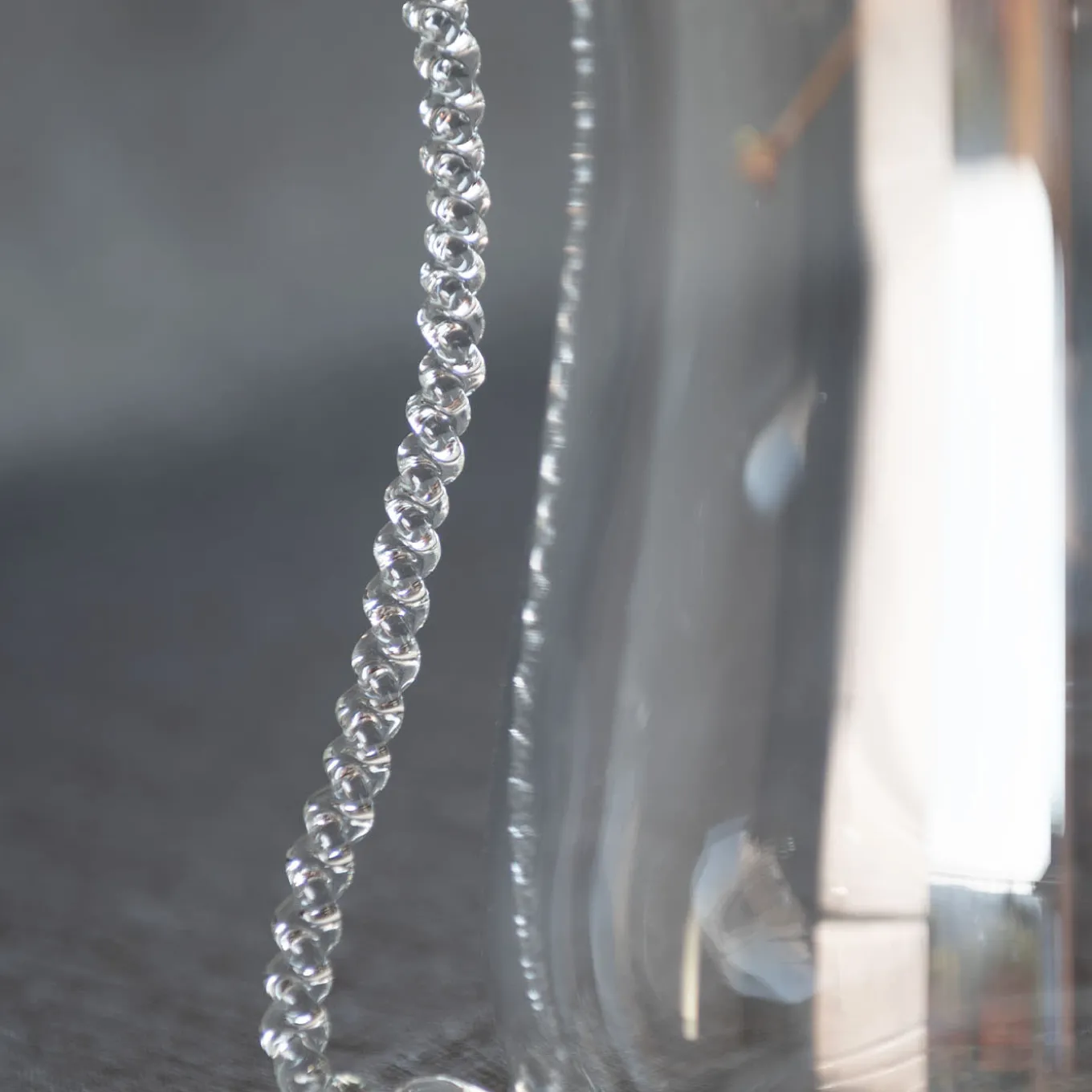 The Metamorphosis vase n.1 transforms the perception of glass with its fluid, organic form inspired by natural patterns and marine life. Characterized by its sinuous silhouette and delicate bead-like embellishments that trace the vase’s contours, it evokes a sense of movement and evolution. Transparent and light-reflective, the piece invites interaction with its environment, shifting in appearance as light changes, blending art and nature in a striking decorative object.
