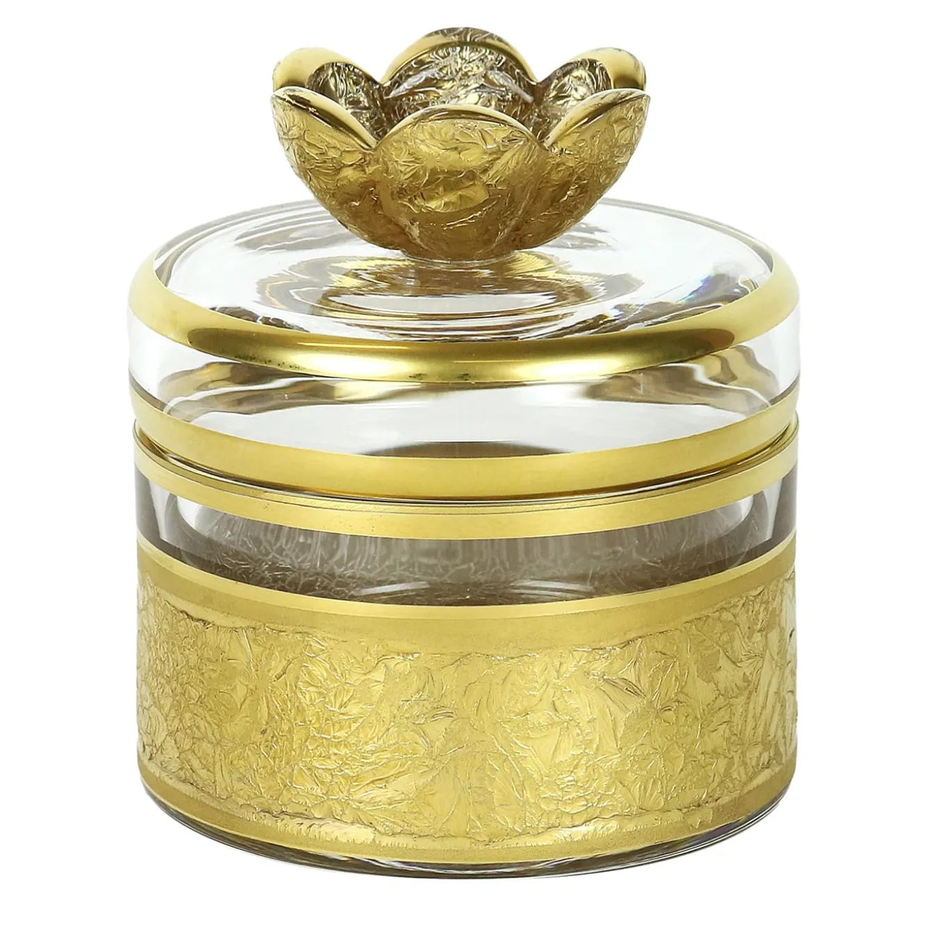 A true homage to artistic genius, this low jar channels the raw beauty of Michelangelo’s “non finiti” sculptures. Part of the Capriccio Collection, its hand-blown glass structure features intricate textures and a luminous gold finish achieved through hand-painted accents. Whether holding jewelry, cotton pads, or serving as a refined décor element, this jar invites a touch of Renaissance grandeur into contemporary spaces.