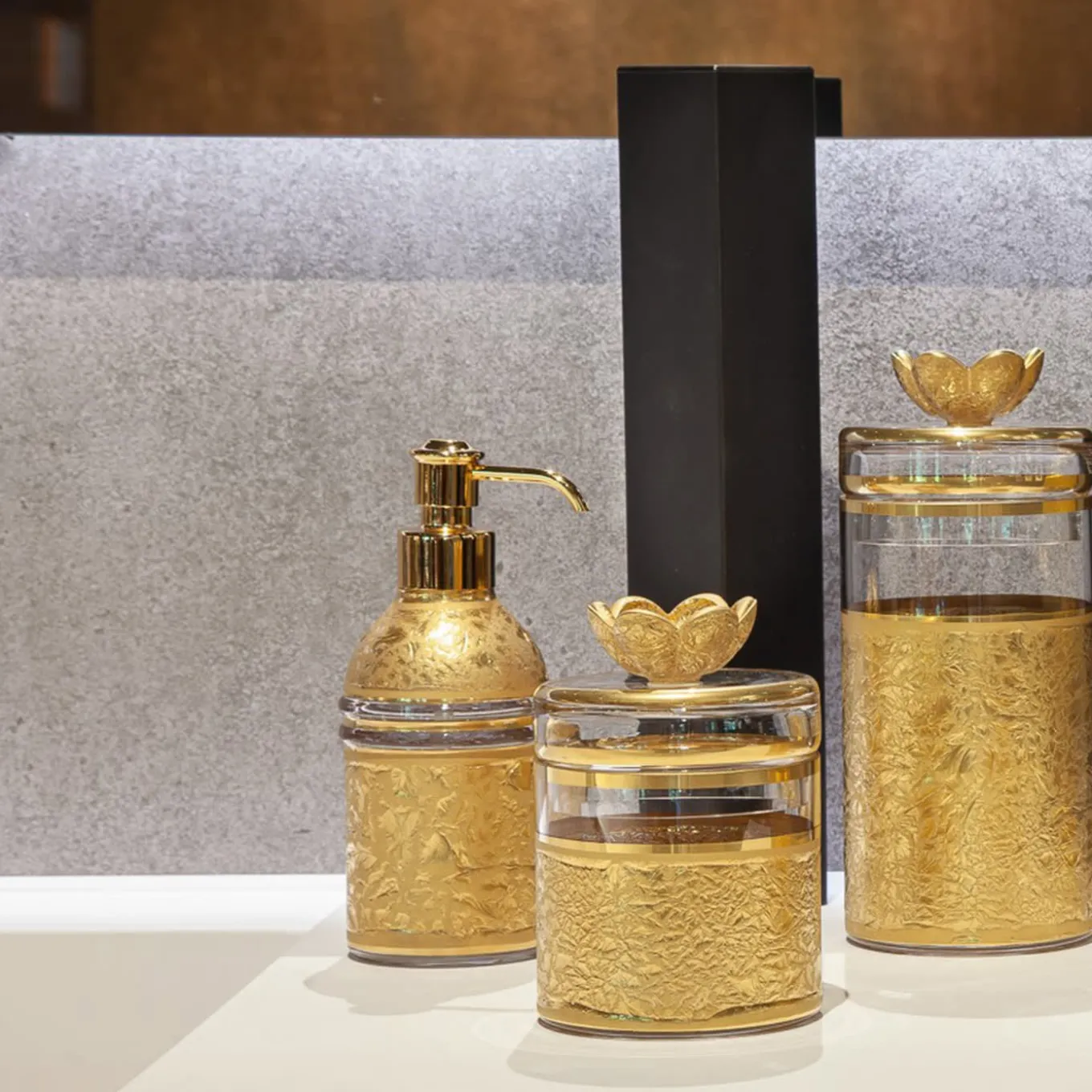 Reimagining daily rituals, this soap dispenser merges utility with artistic splendor. Part of the Capriccio Collection, it features hand-blown glass adorned with sculptural textures, a nod to Michelangelo’s unfinished masterpieces. Hand-painted in rich gold, the dispenser exudes elegance while offering practicality for hand soaps or lotions, making it a refined addition to luxury bathrooms and vanities.