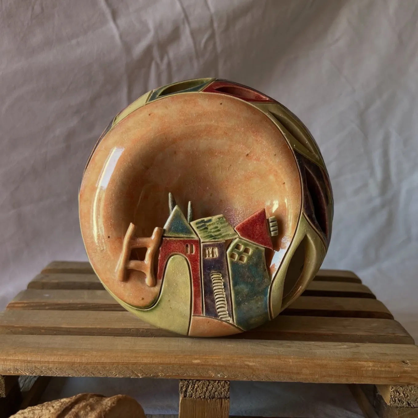 This medium-sized wall sculpture features a hollow spherical shape that encapsulates a miniature village scene, evoking themes of memory and the soul’s landscape. Crafted entirely by hand with recycled materials through a double firing process, the piece displays subtle, natural color variations achieved by unique ceramic glazes mixed with beech wood ash. Each sculpture is perforated, hand-painted, and embodies a philosophy of finding value beyond the visible, making every item a distinct artistic fragment. Due to its artisanal nature, each item may present slight variations in color shades, dimensions, and weight.