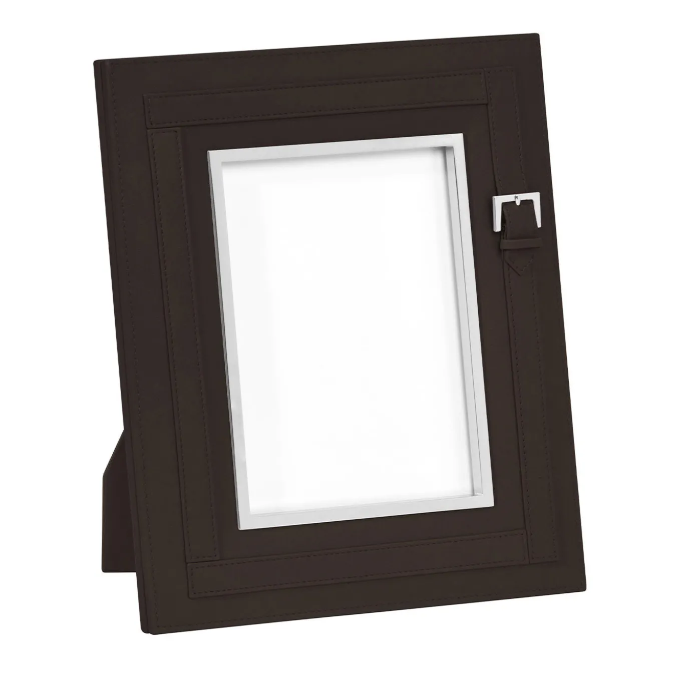 Showcase cherished moments with friends and family with this exceptional picture frame. Showcased at the Salone del Mobile 2024, this Mila picture frame by Gio Bagnara is minutely crafted, the supple dark brown leather deftly molded around the rectangular frame (13x18cm). The distinguishing element is the belt buckle detail adding a subtle novel twist on a timeless silhouette. Available in chrome or gold details upon request, please inquire with the Concierge for details.