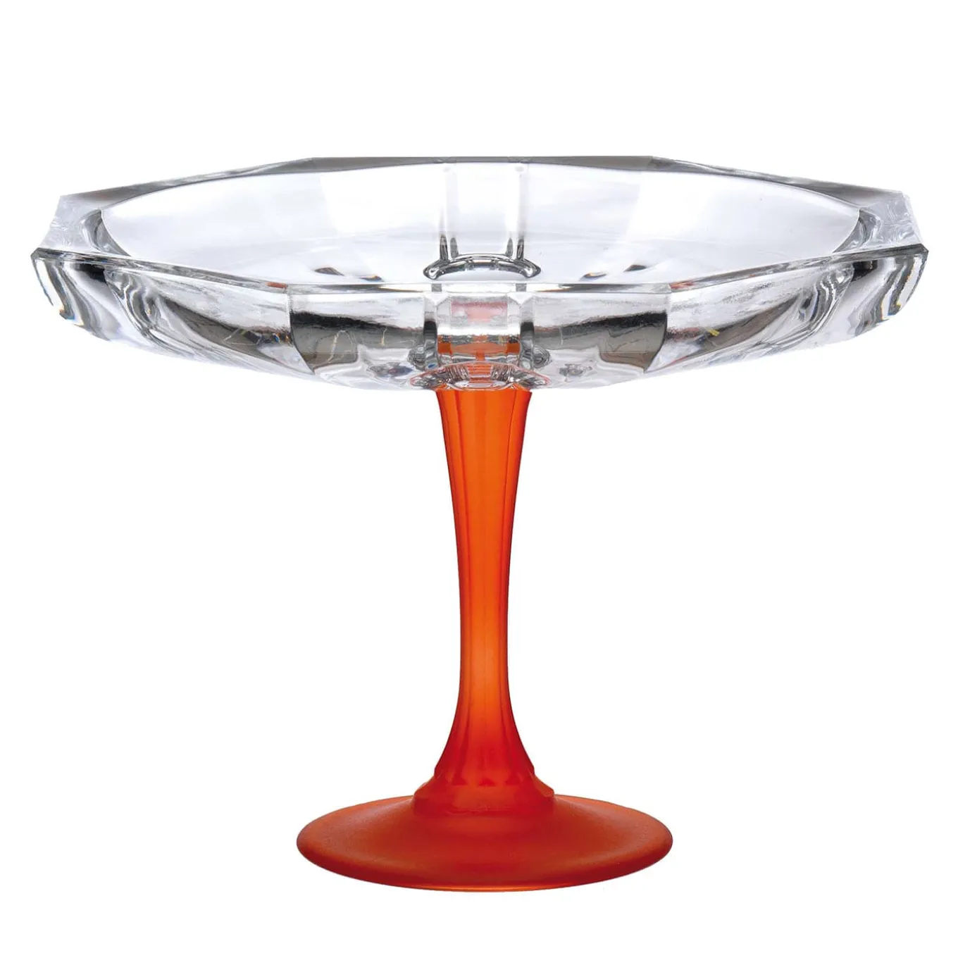 A slender pedestal base in opaline orange crystal decorated by hand lends this centerpiece bowl grace and vibrancy at once. The fascinating transparency of the bowl, distinguished by a faceted embossed design, establishes a contrast resulting in particularly apt for suiting elegant modern and contemporary decors. The rest of the Milano Collection can be explored in the Artemest catalog.