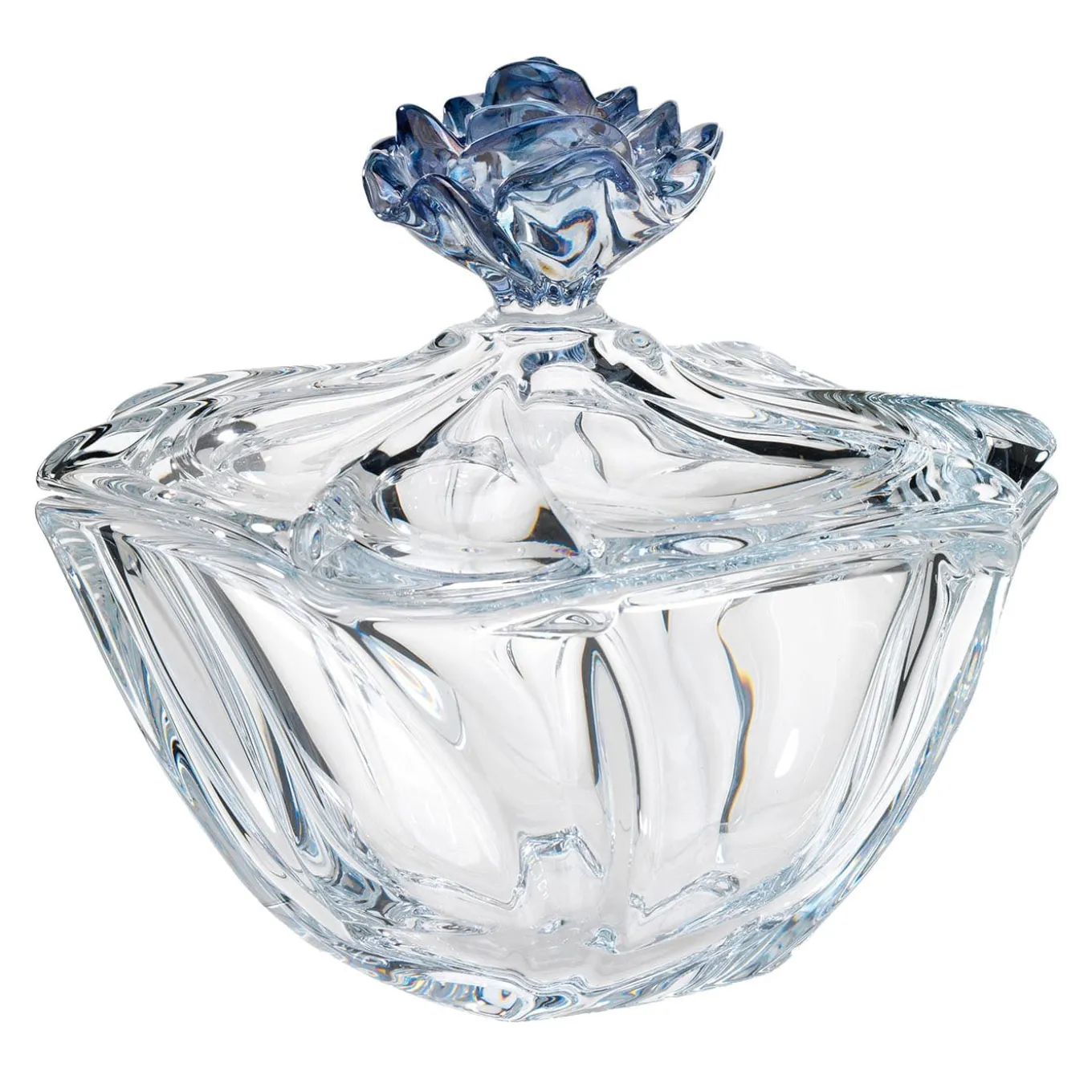 A marvelous embossed design coupled with striking gleam and transparency marks this refined glass box from the Milano Collection. Defined by sinuous and dynamic lines, its silhouette comes complete with a matching lid at whose top sits an azure-toned finial in the shape of a blossoming flower that infuses the piece with pure femininity. Ideal for gathering candies or jewelry essentials.