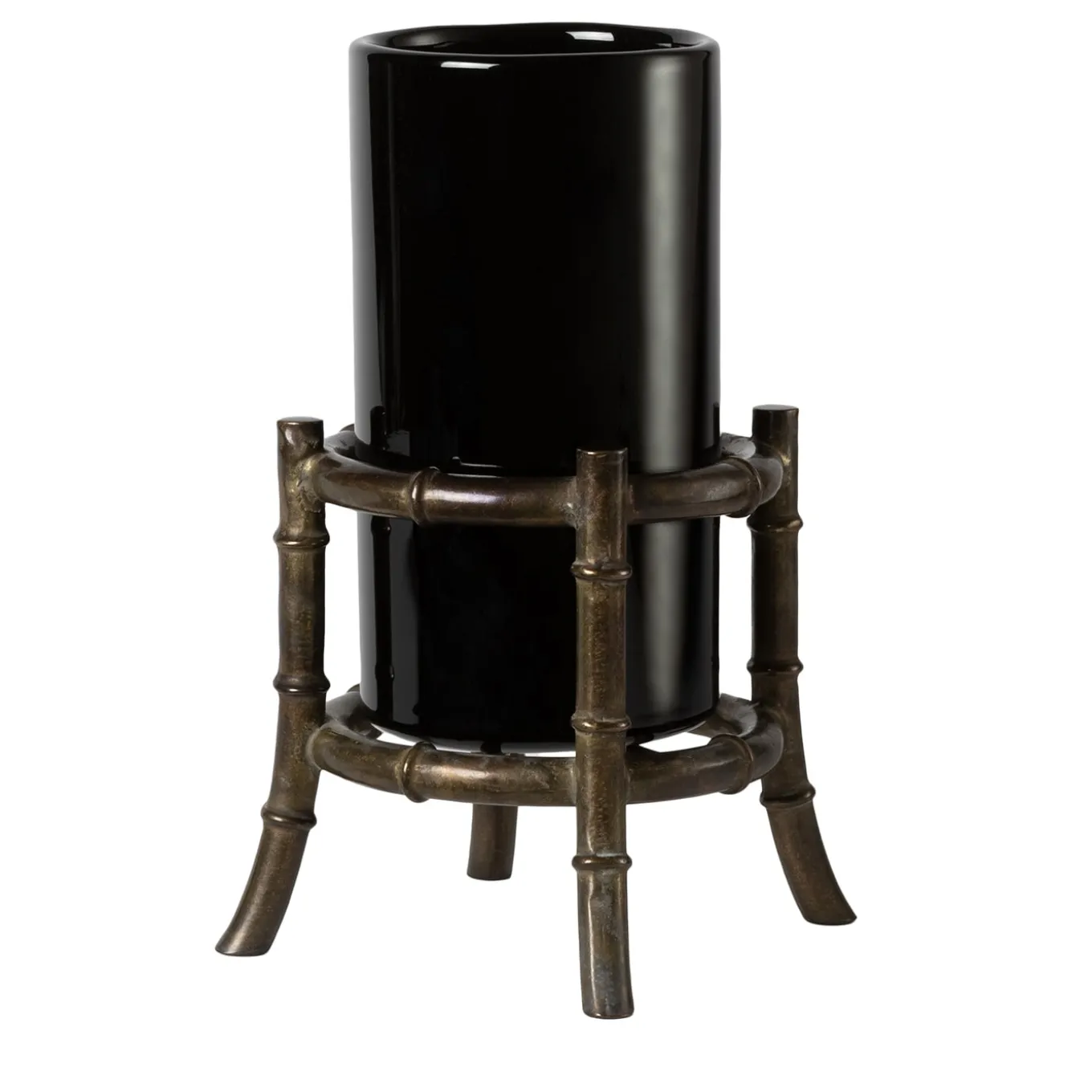 The Mini Bamboo Vase is a striking blend of artistic vision and traditional craftsmanship. Designed as an elaborate expression of an imaginary garden, this sculptural vase features elegant biomorphic curves made from bronze, seamlessly encasing a glossy black glass cylinder. This piece reflects a harmonious partnership of two artisanal techniques: the bronze base is meticulously crafted using the ancient sand casting method, while the glass vase is expertly mouth-blown. This duality not only showcases the beauty of each individual medium but also emphasizes the overall strength and character of the design. Whether adorned with vibrant flowers or displayed as a standalone statement, the Mini Bamboo Cache-Pot transcends typical décor, bringing an element of refined elegance to any space. Its silent beauty shines, making it a versatile addition to home décor that appeals to aesthetic sensibilities.