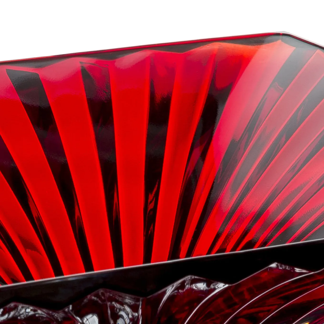 This centerpiece, entirely hand made using the mouth-blown glass technique, has a square, elegant shape to display small objects and precious things. This piece is in a striking red hue with a ruffling pattern, similar to that of fabric, decorating its entirety.