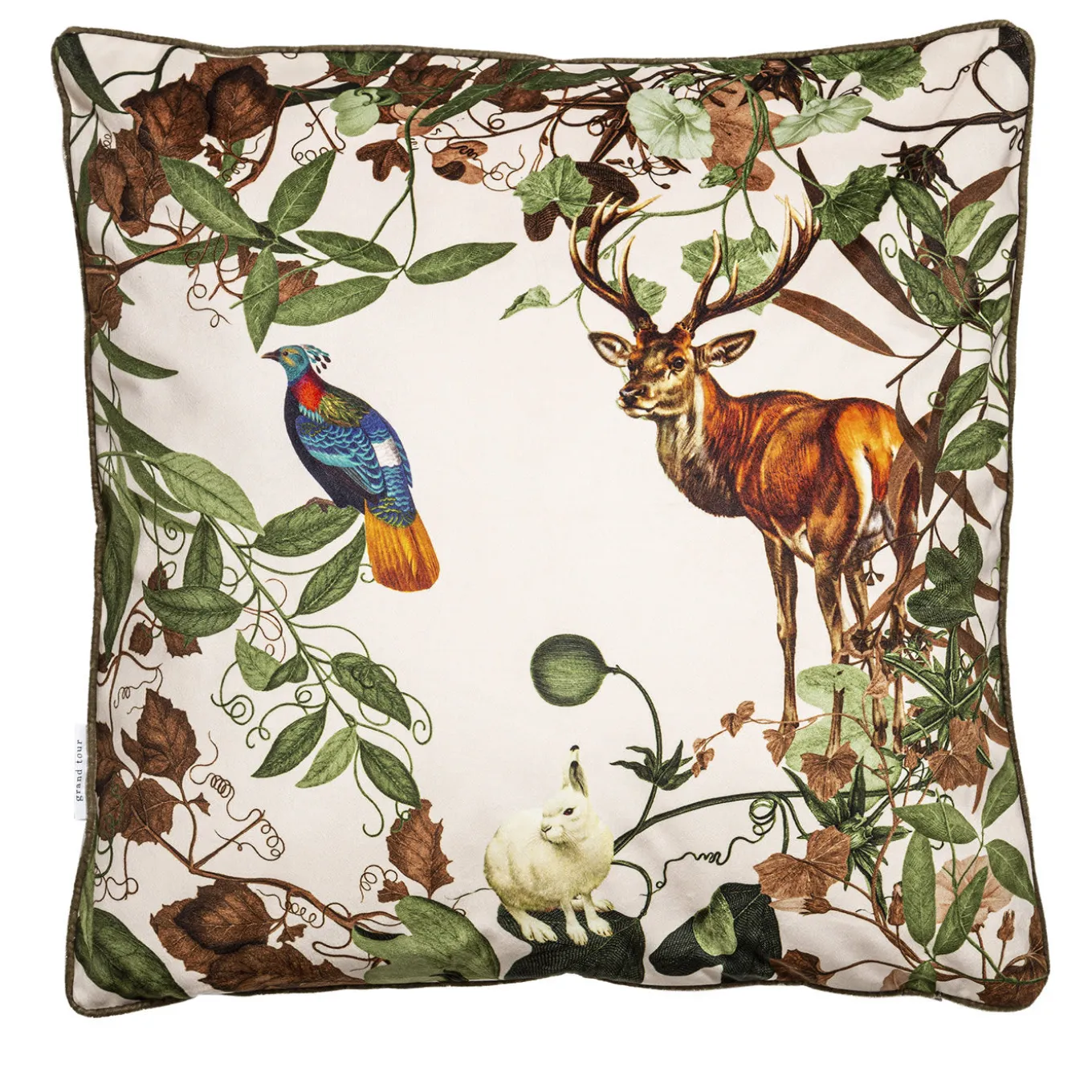 This enchanting cushion belongs to an exclusive series inspired by the vegetation and fauna typical of the Alps, of which Mont Blanc is the highest peak. A colorful pheasant, a fierce deer, and a white rabbit are incorporated in the graceful frame made up of intertwining branches and leaves printed in vibrant tones onto the white polyester velvet upholstery.