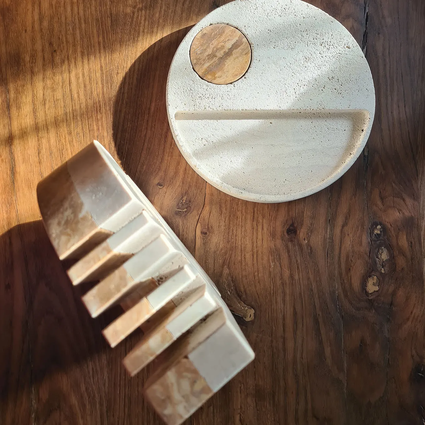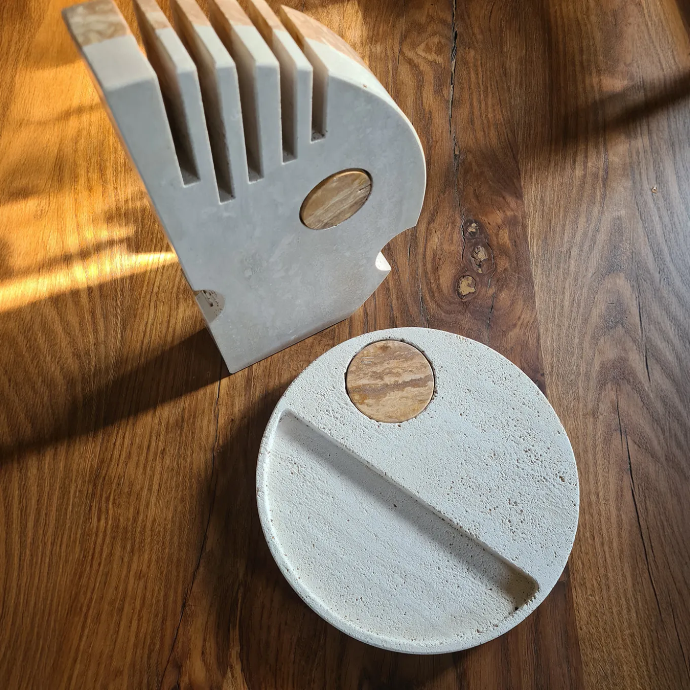 Drawing inspiration from timeless materials, this dual-sided sculpture is part of the Convivio collection. Roman and Persian travertine are seamlessly paired to create a striking form. The removable bicolor “eye” adds versatility, functioning as a paperweight or decorative accent. With its bold geometric cuts and multifunctional use as a bread or napkin holder, this piece merges art and practicality in a unique and engaging way.