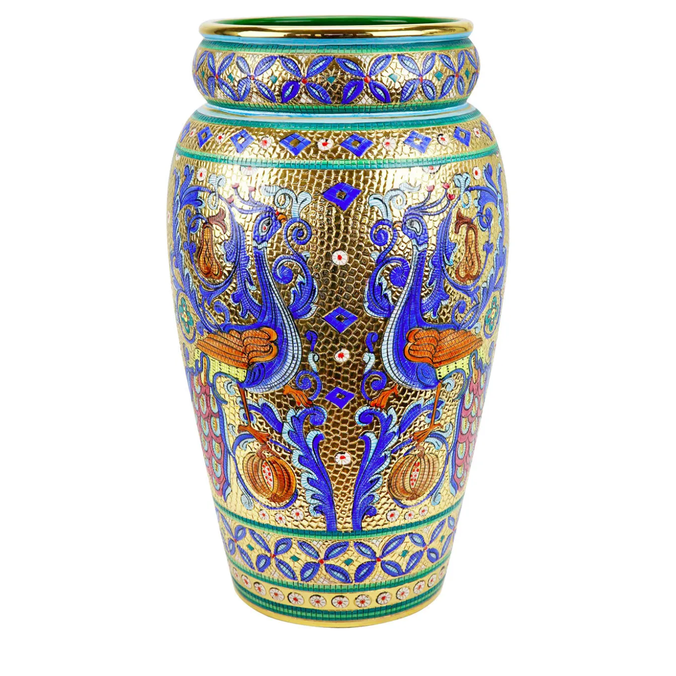 The bold, imposing size of this superb vase will make it the stand-out element of a spacious living room or entryway as an umbrella holder. The vase’s handcrafted ceramic silhouette is decorated with a technique developed by Sambuco that recalls mosaic tiles by engraving a multitude of small tile shapes onto the ceramic. The ornate motifs draw inspiration from the lavishness of Byzantine artifacts and are adorned with precious gold for an opulent effect. A third firing fixes the color on the ceramic