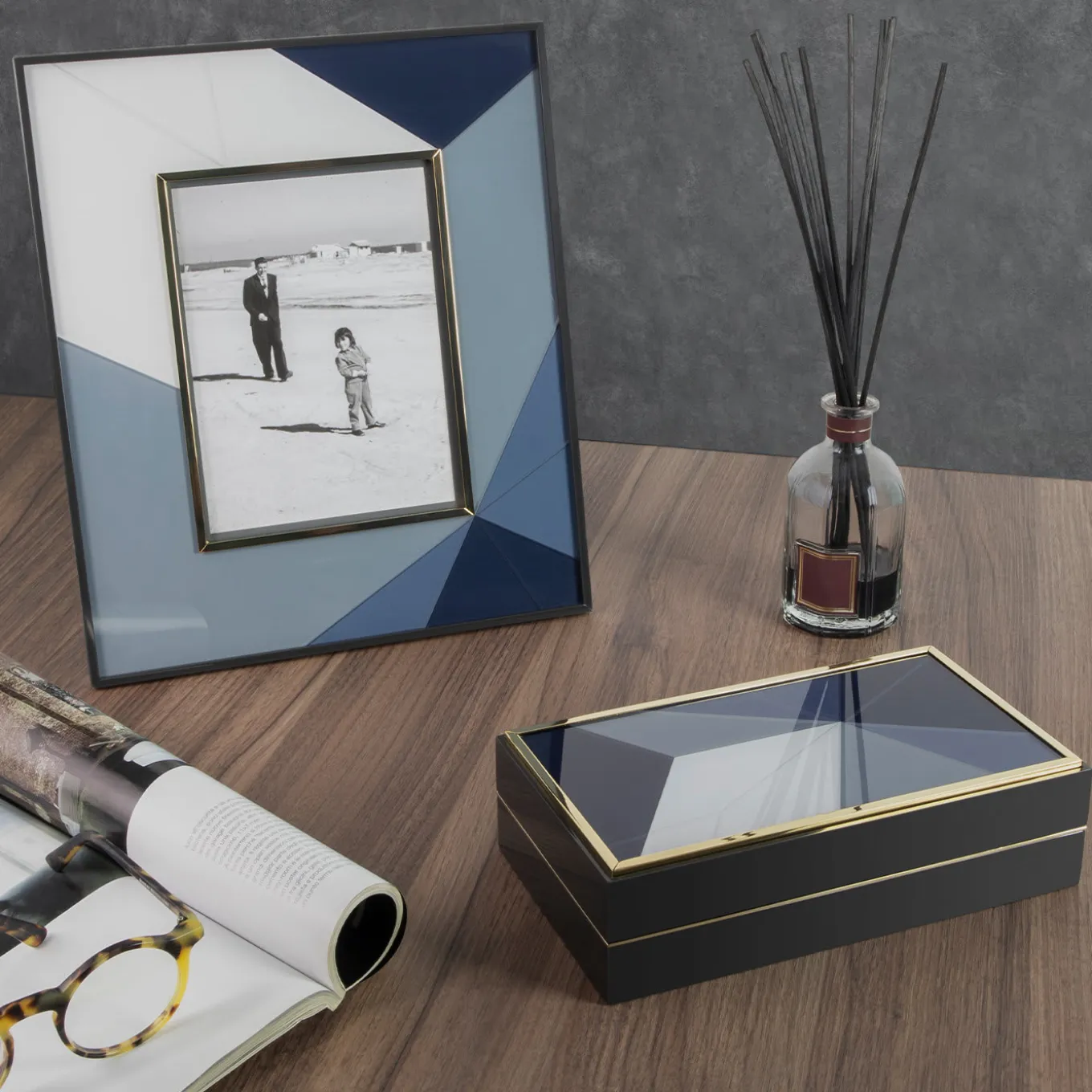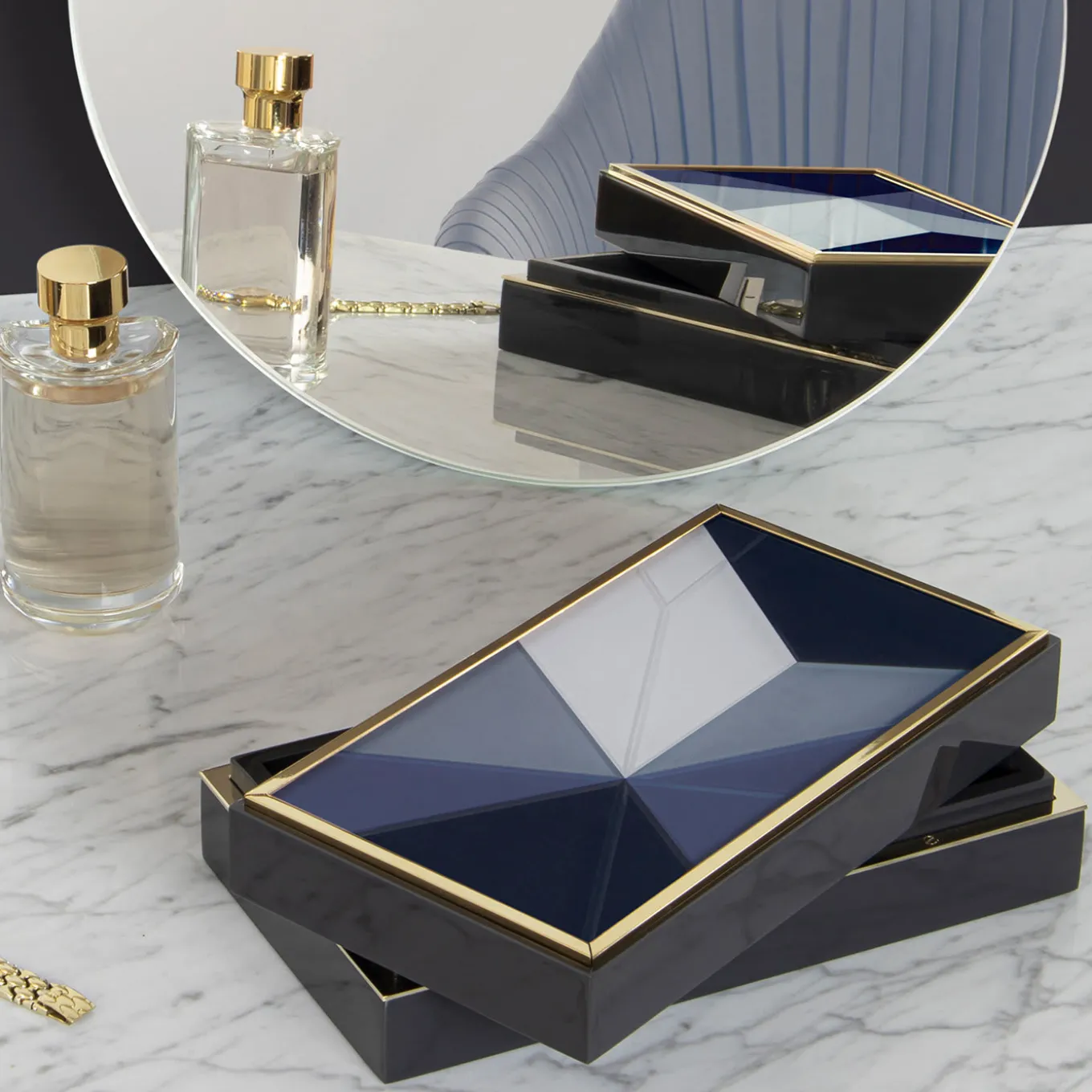 Inspired by the geometric patterns of ancient Florentine marble floors in four colorways: blue, rosé, trench and green. The collection is further adorned by settings made of brass with a gold finish.