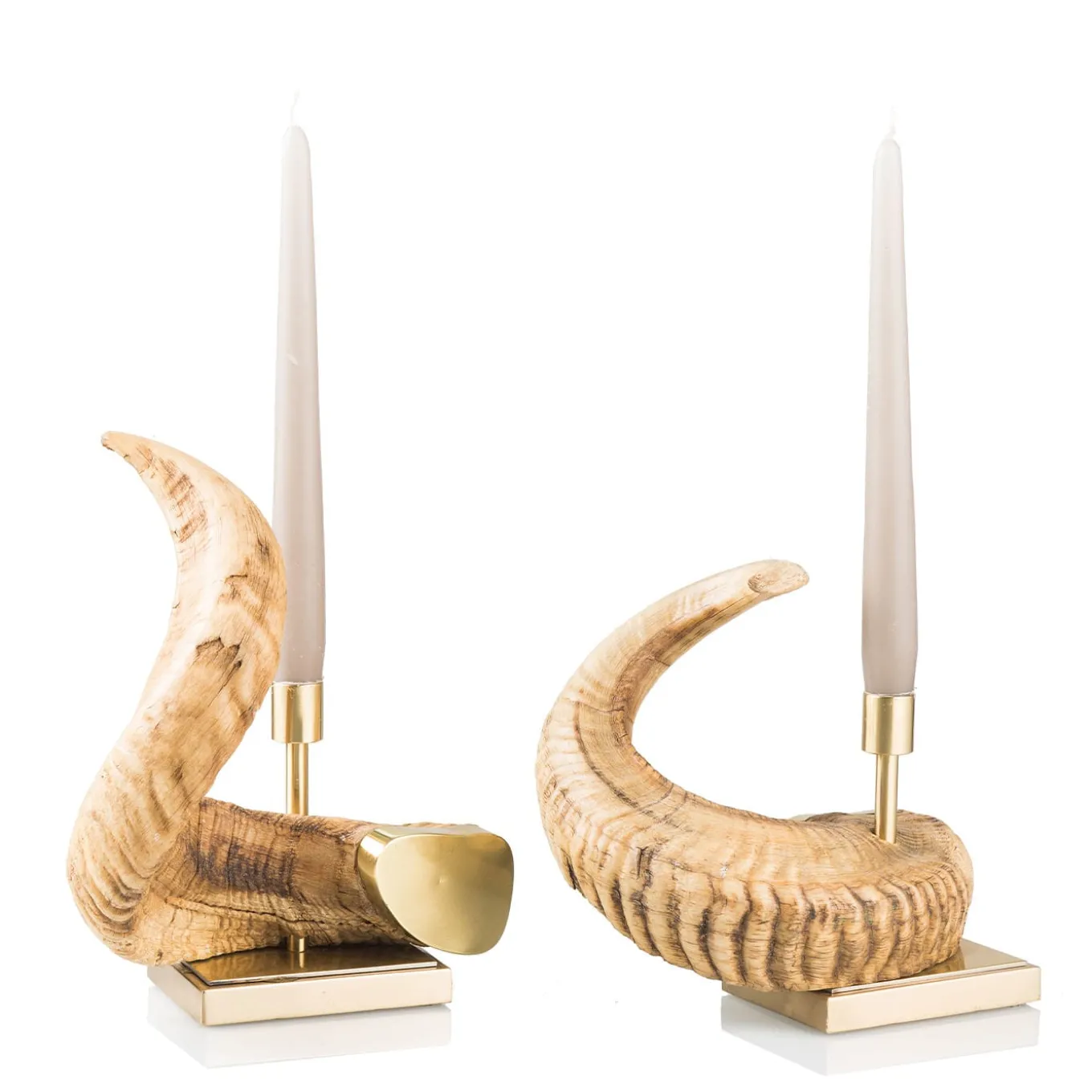 Experience the artistry of nature and skilled craftsmanship. This exceptional candelabra features a genuine mouflon horn, showcasing its unique texture and form. The natural brass base is meticulously crafted, providing a perfect complement. Comes complete with ivory candle.