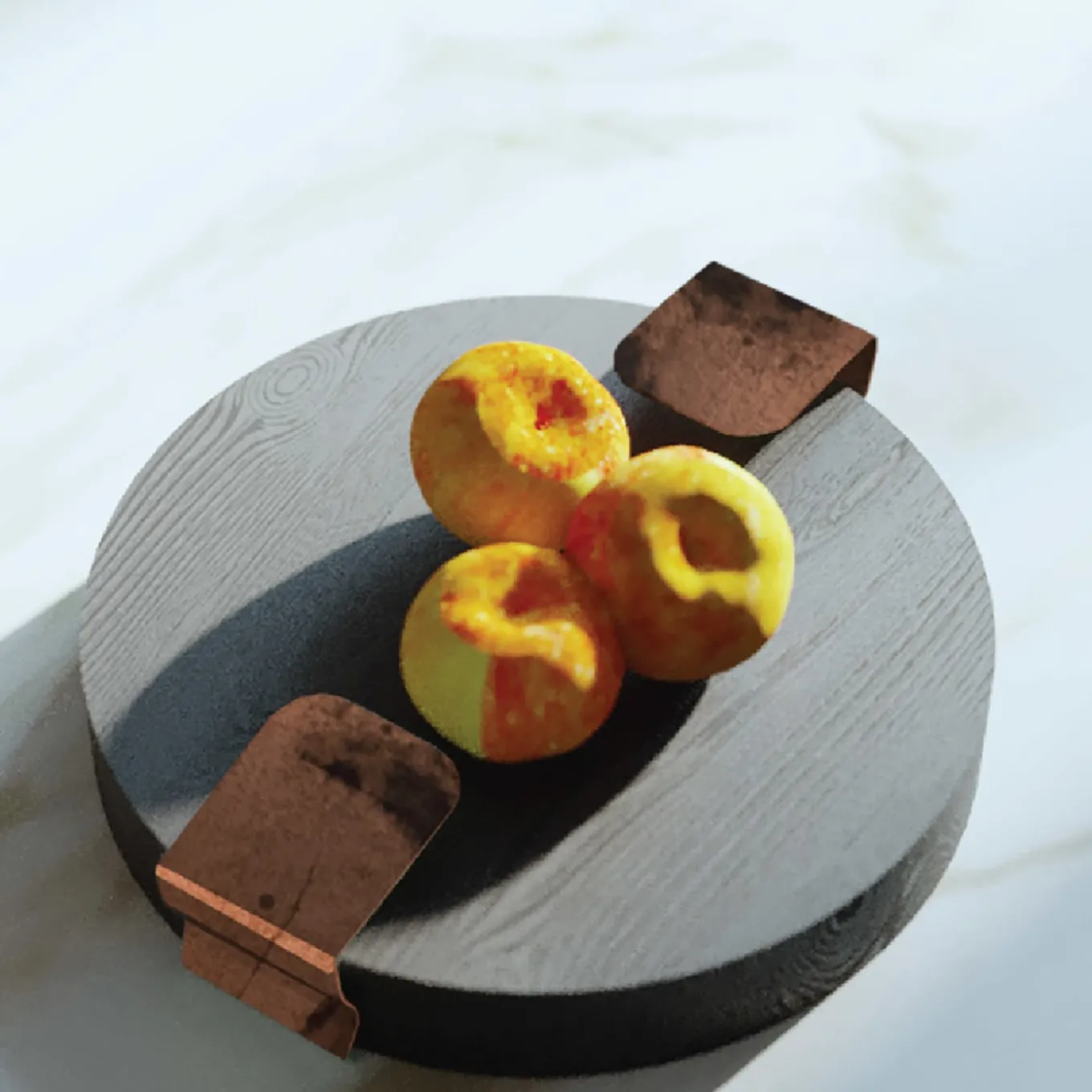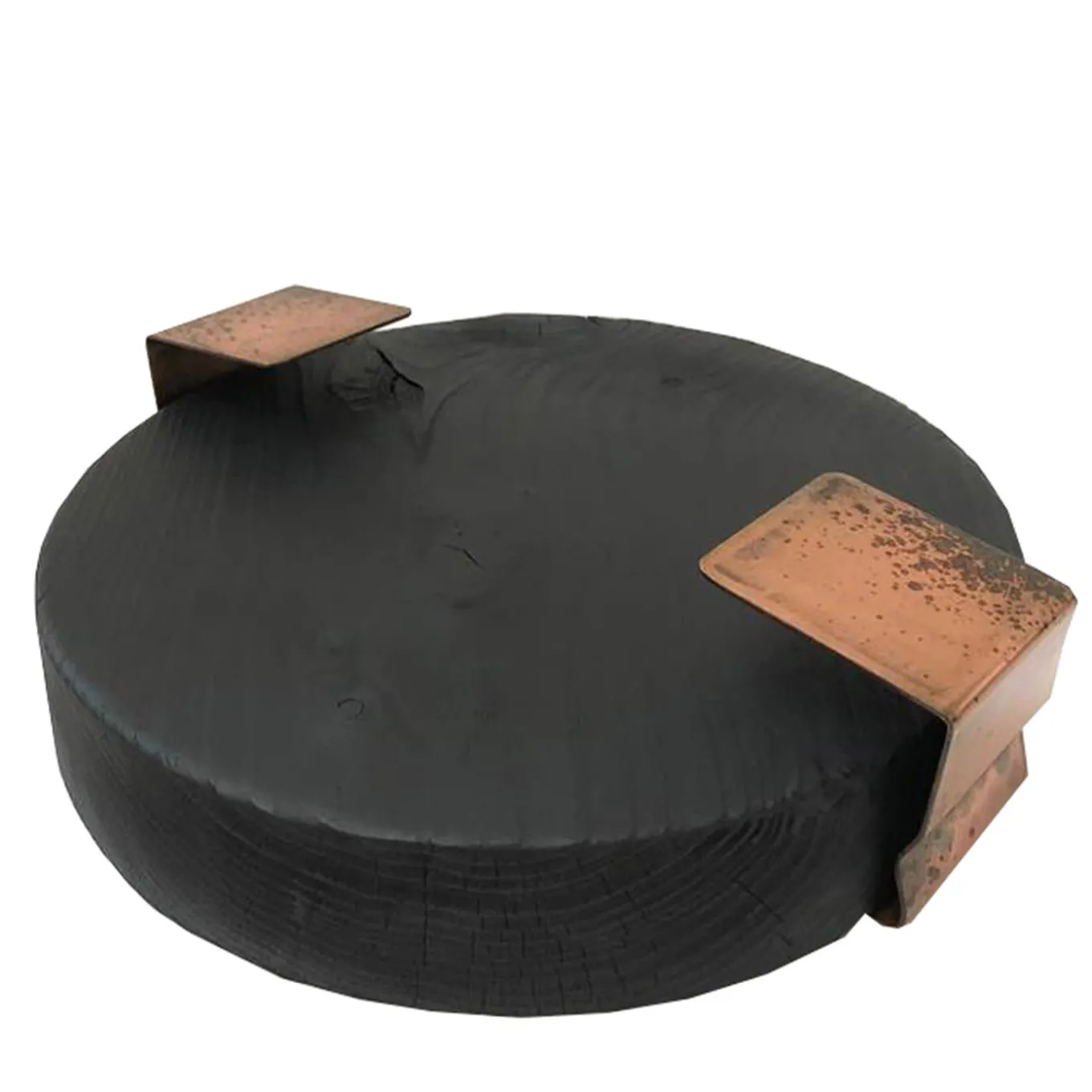 Inspired by the past, the Mummoli Collection evokes the profile of original elements as a memory of time and regenerates them through processes of deconstruction and functionalization. An object of high craftsmanship made of cedar wood, recovered and carbonized using the Japanese Shou Sugi Ban technique, the centerpiece is embellished with copper-plated etched iron elements. It has a strong, textural character while maintaining the essentiality of the lines.
