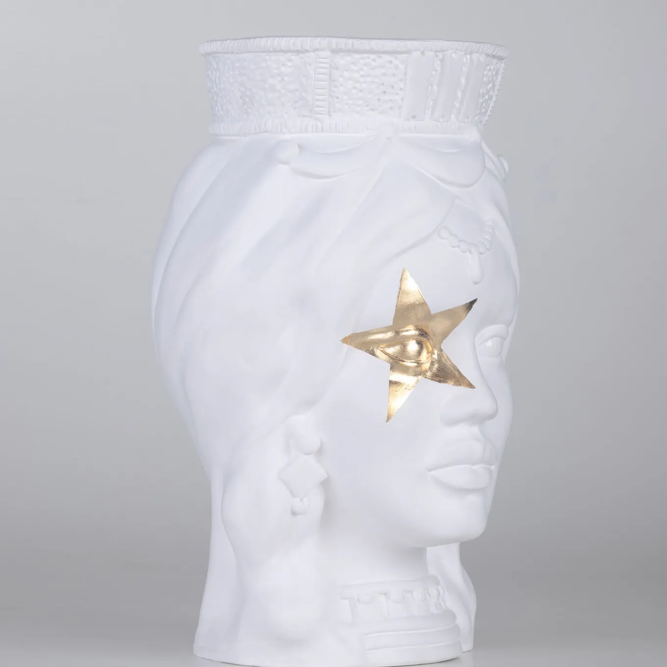 Entirely handmade of terracotta, this anthropomorphic vase depicts Musidora (Greek word for “gift of the muses”), a young woman wearing a crown with her hair gathered in a soft turban. Her noble visage, framed by jewels, is characterized by piercing eyes and voluptuous lips to emphasize her bold expression. Finished by hand with white matte glaze, a gold foil star is placed on one of her eyes to enhance her striking gaze. The vase cannot be filled with water.