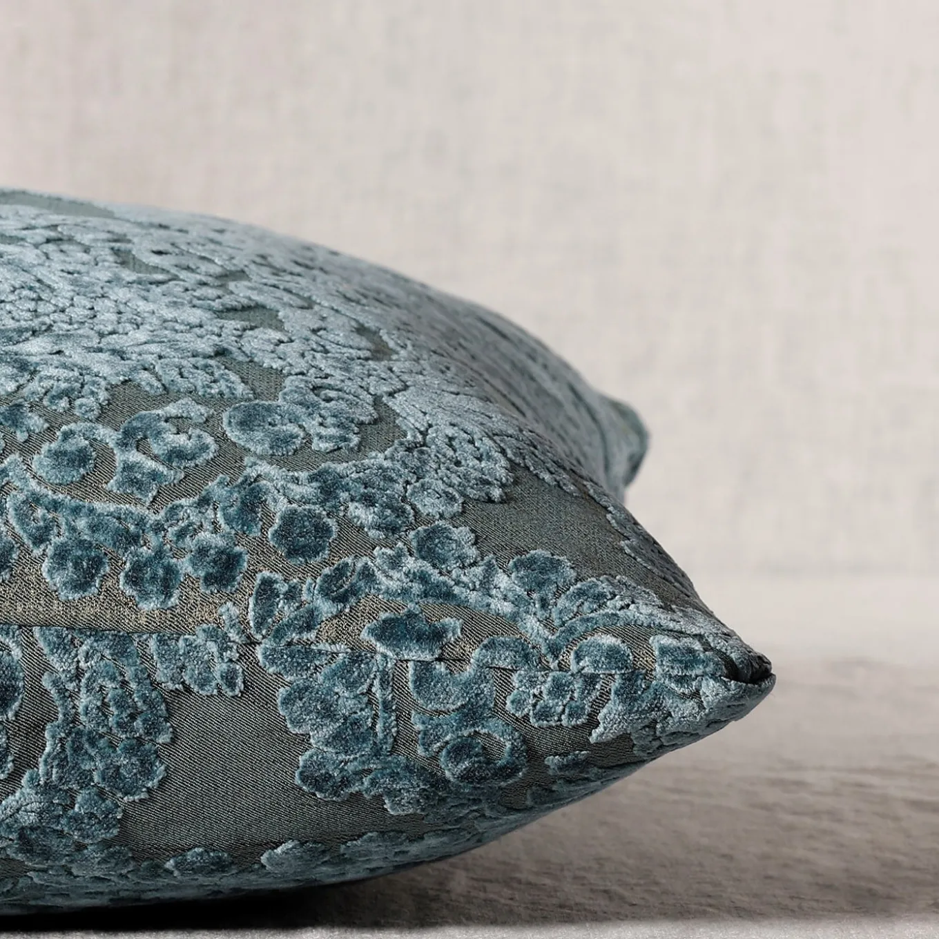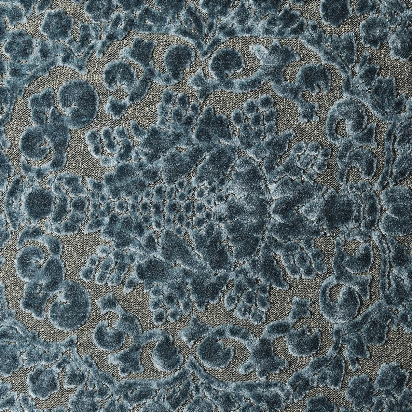 Naiadi recalls the grotto of the freshwater nymphs. The jacquard velvet ebbs and flows from the gold background. The blue of the water slowly carves away the stone, creating space for hidden treasures of Ulysses.