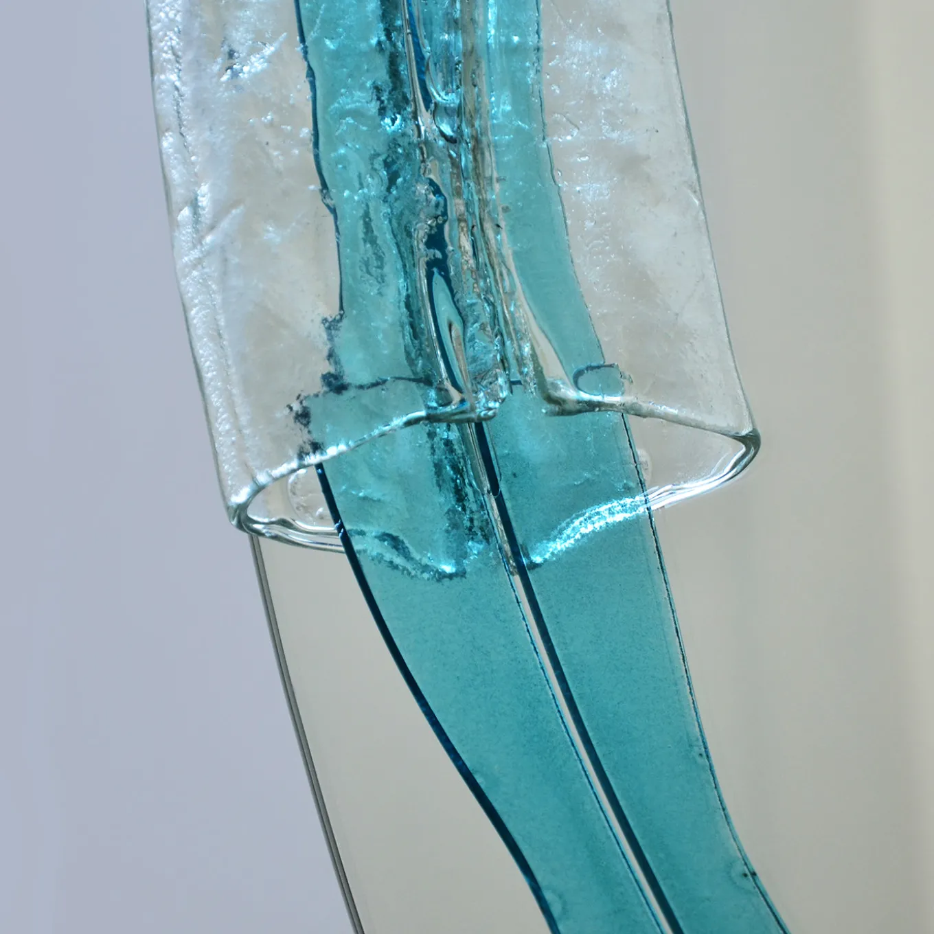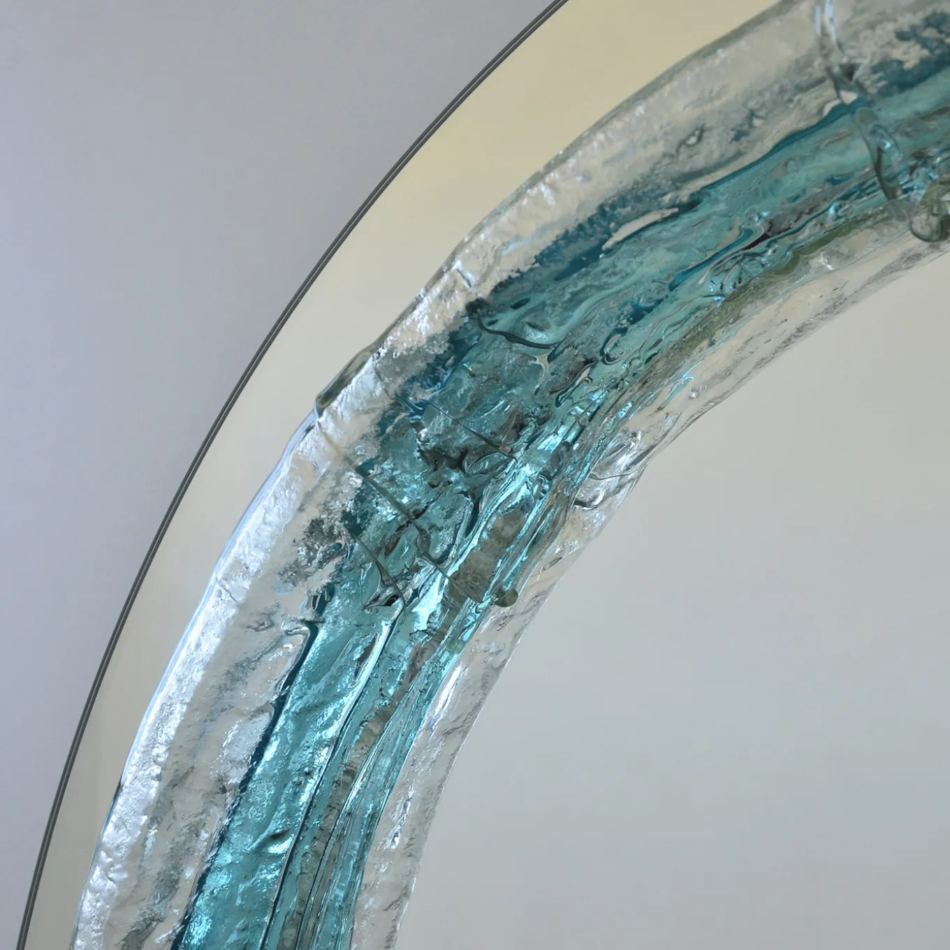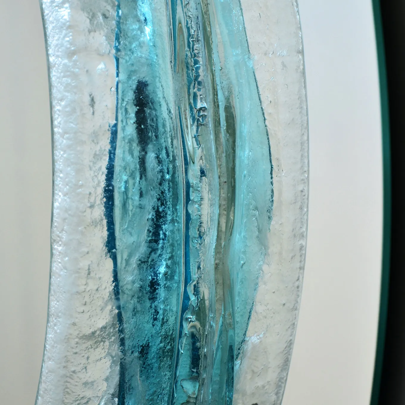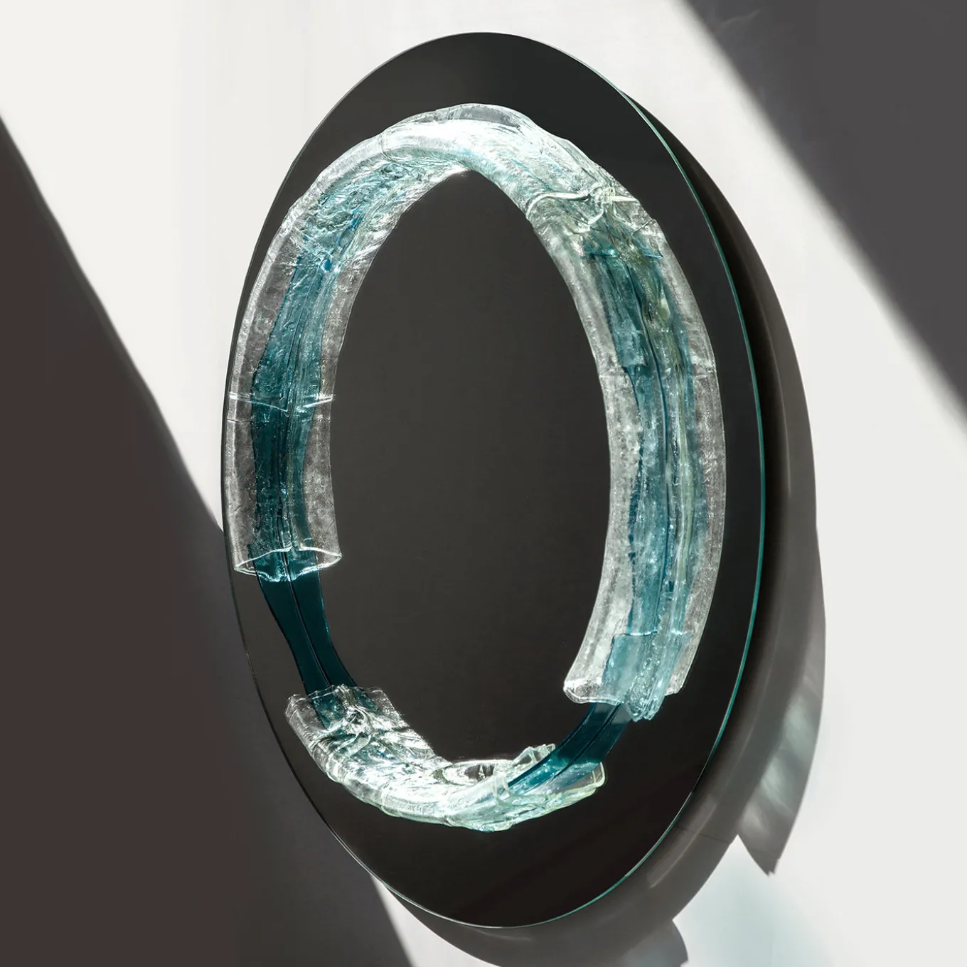 The Naias round crystal mirror features a diameter of 100 cm and showcases a flowing aquamarine glass element fused with recycled crystal. Its design draws inspiration from the myth of the Naiads, evoking the movement and vitality of flowing springs. The mirror’s soft curves and transparent materials create a vibrant, pulsating effect, combining innovative aesthetic research with sustainable craftsmanship.