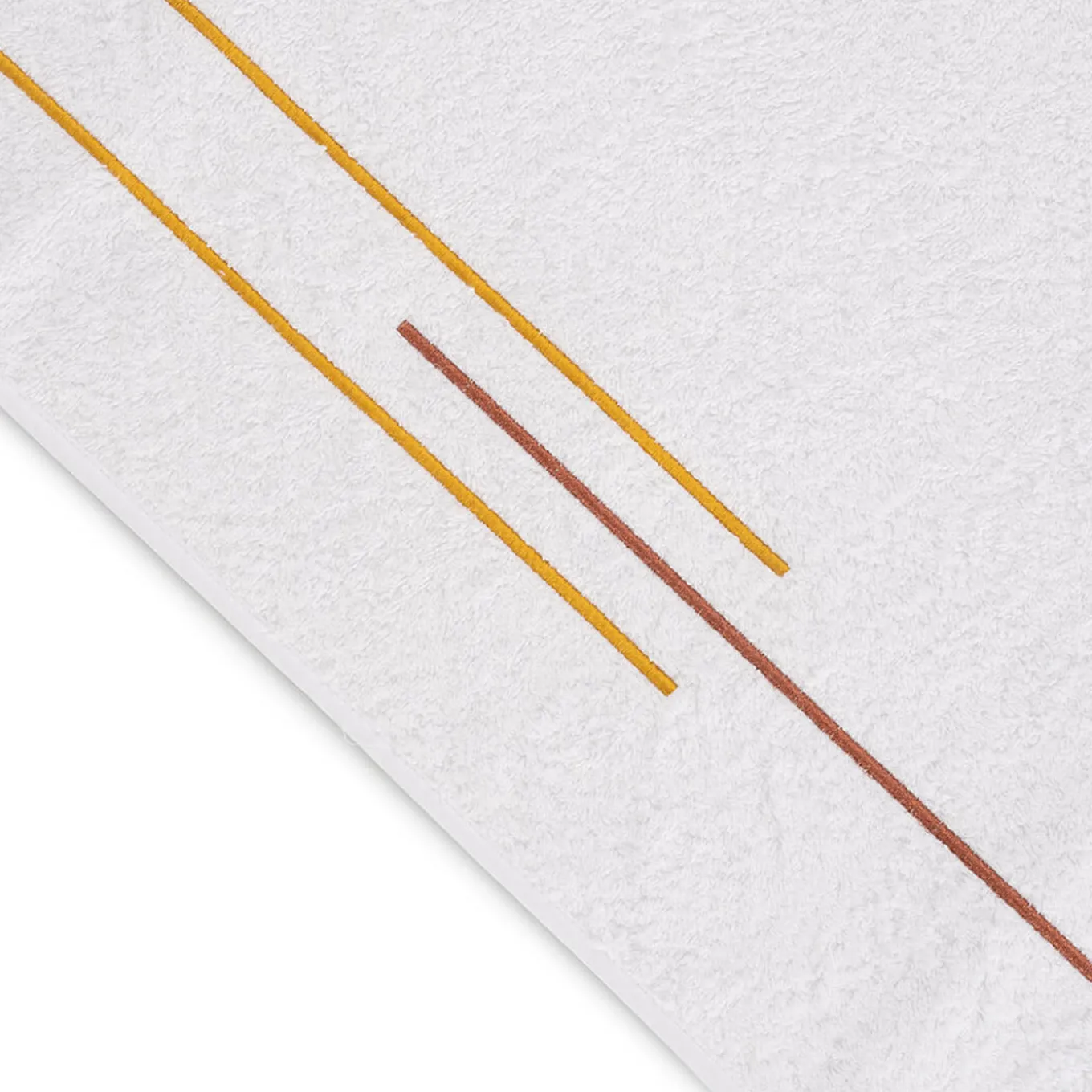 Namasté Towels Set includes a bath towel (110 x 150 cm), hand towel (60 x 100 cm), and guest towel (40 x 60 cm) crafted from dense 550 gsm white cotton terry. Each piece features bias finishing and distinctive embroidery on one short side, combining subtle elegance with practical absorbency for everyday use.