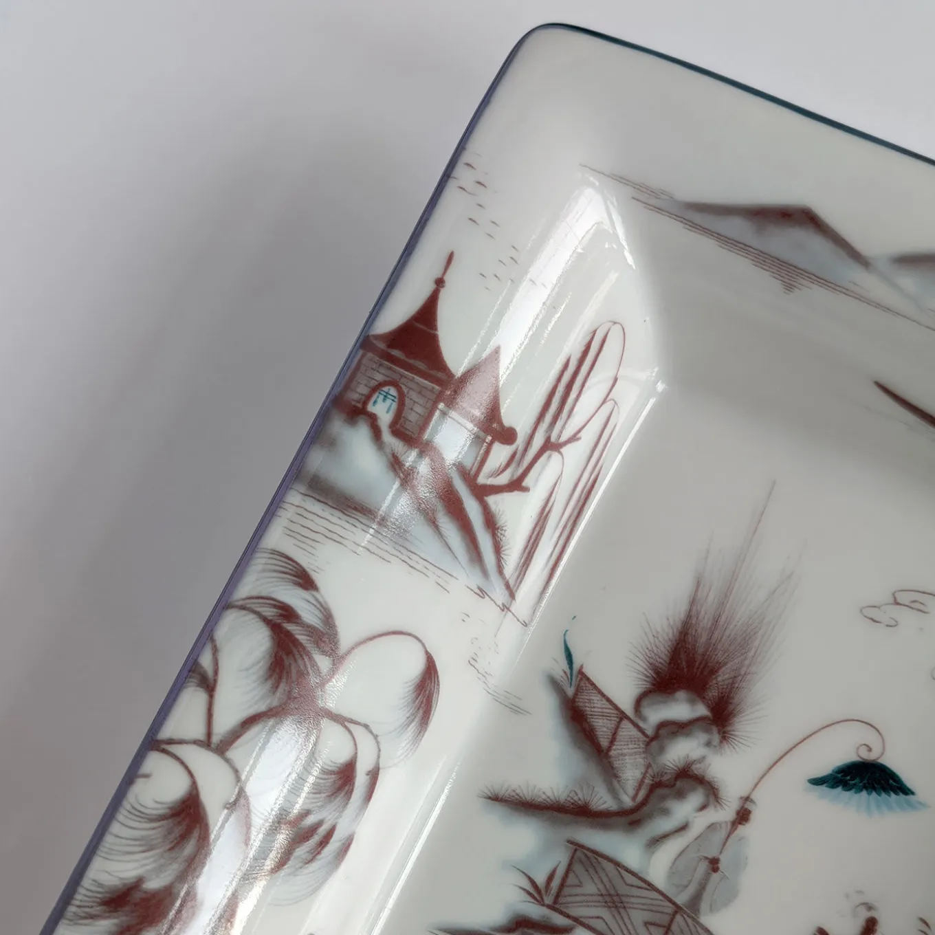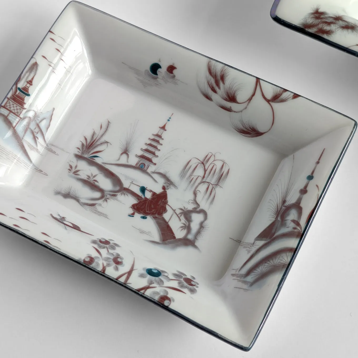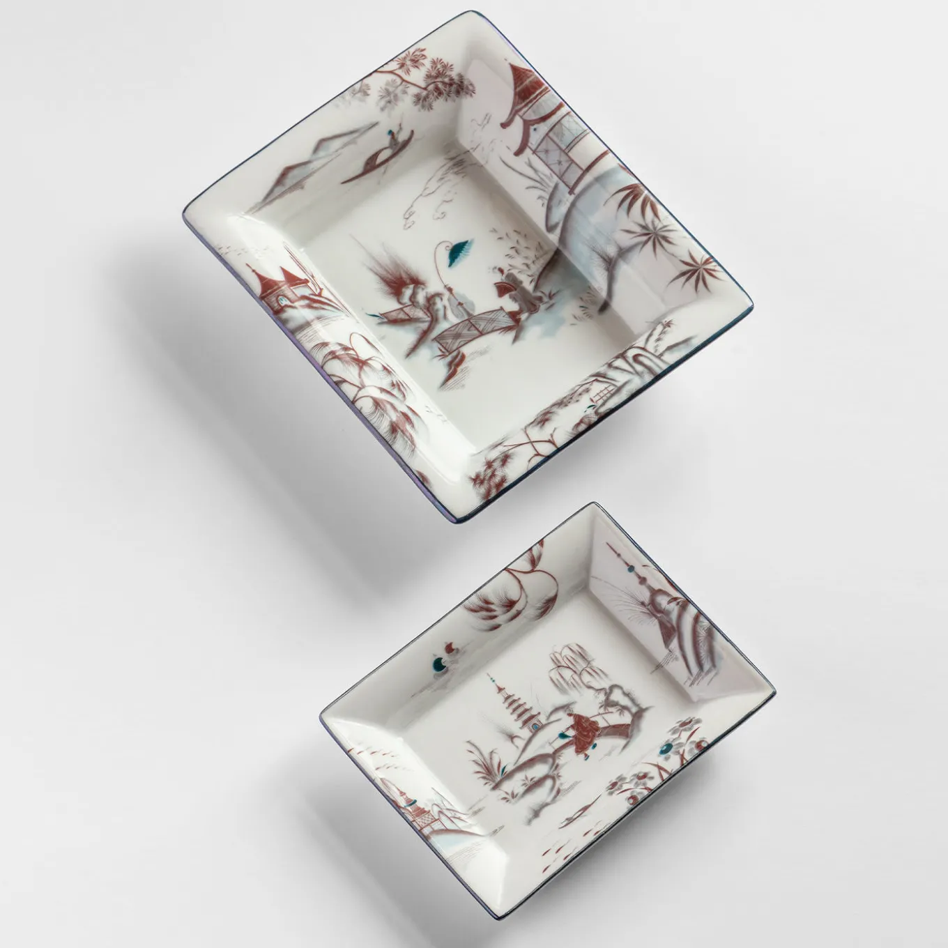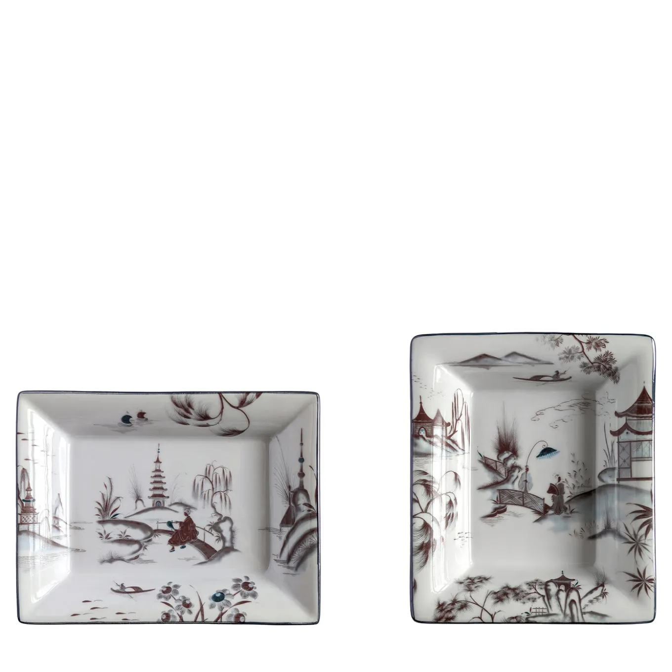 The relaxing feel of Japanese rural landscapes is celebrated by this splendid porcelain set comprised of an ashtray (cm 15 x 11.5 x 2.5 H) and a vide-poche (cm 19.5 x 16 x 4 H). The reddish profiles of traditional abodes, boats, trees, and a small bridge are enhanced with misty blue shades lending the scenario an enchanting, dream-like allure. An ultra-thin, luminous rim completes the design.