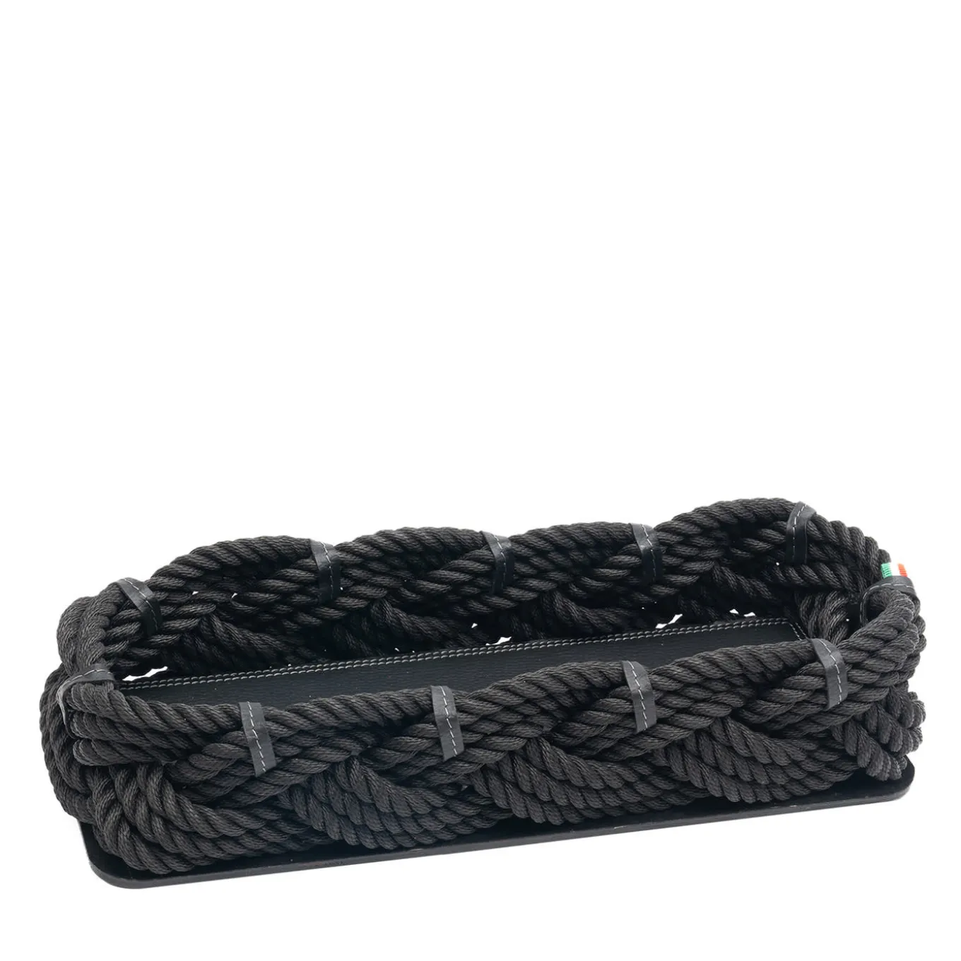 Intricately woven with care and precision, this black medium rectangular rope basket stands as a testament to exquisite craftsmanship. Its undeniable beauty captivates the eye, with the interplay of woven ropes forming sturdy yet elegant walls, complemented by a fabric bottom for visual contrast. Reminiscent of maritime journeys and the boundless sea, these intertwined ropes speak to the artist’s deep connection to the ocean.