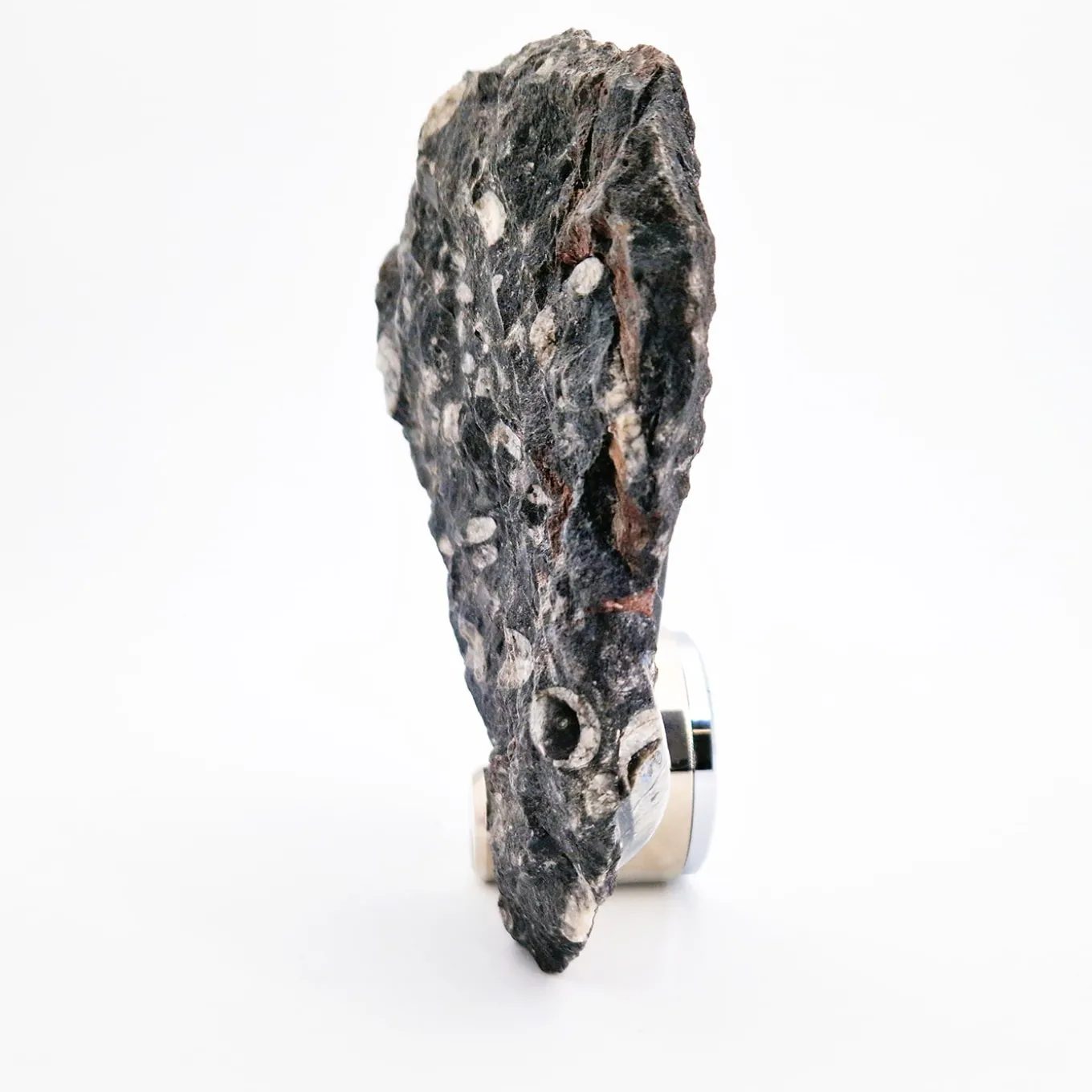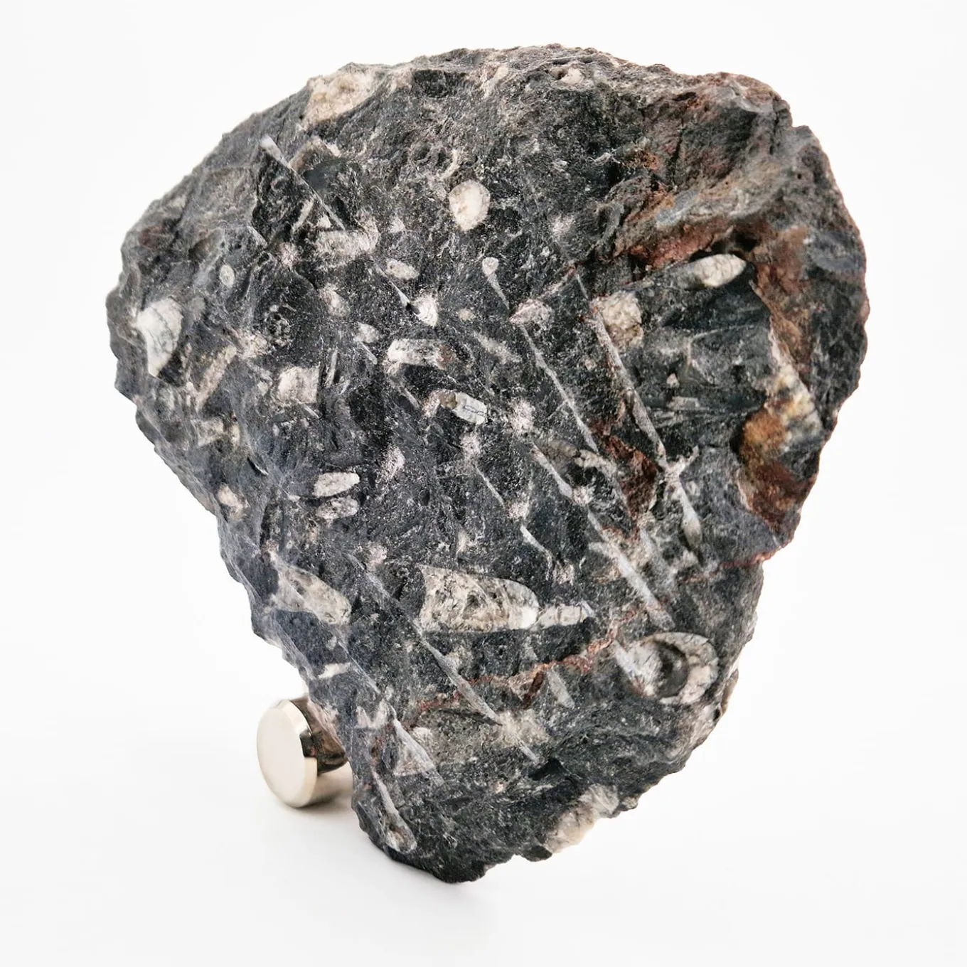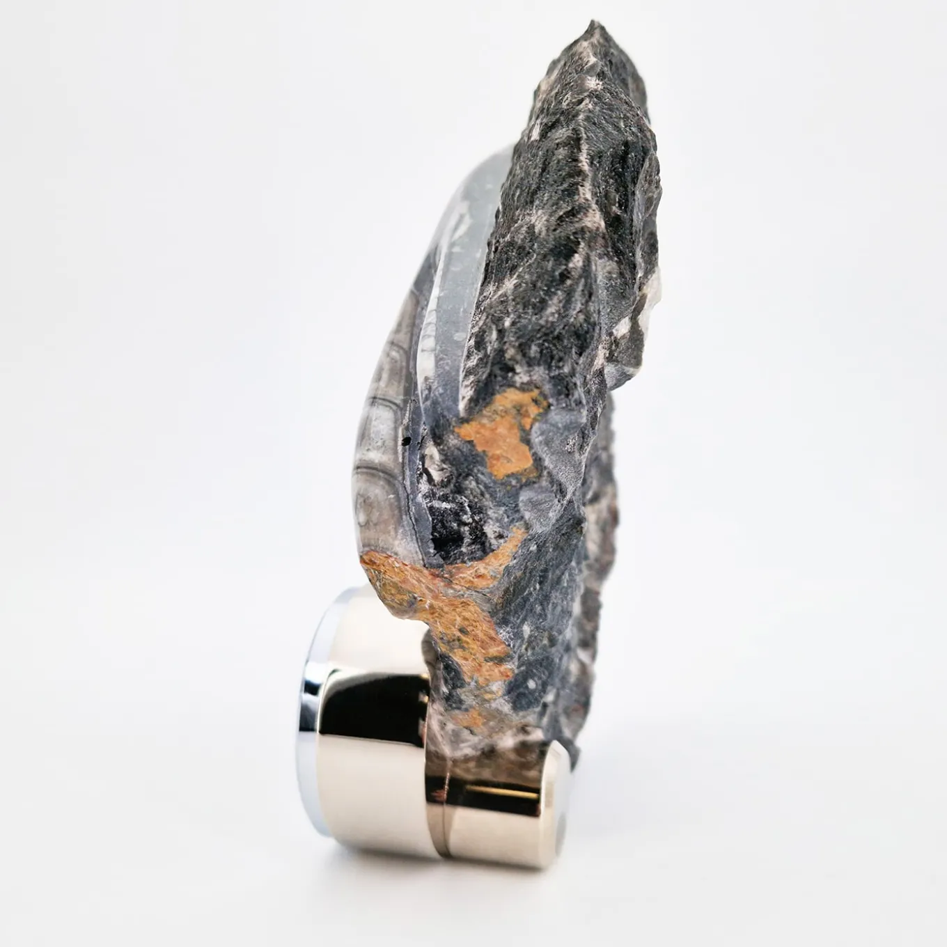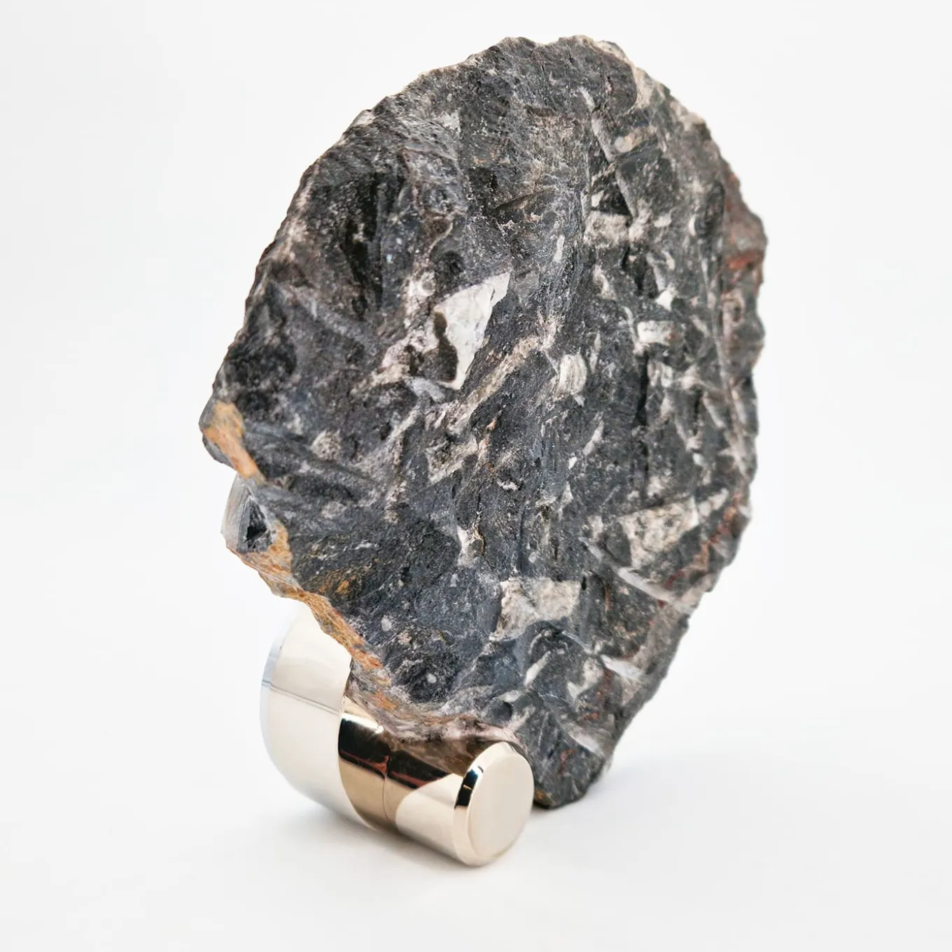 A fascinating testament to 400 million years ago, the deliberately irregular piece of stone of this sculpture strikes with authentic ammonite fossil shells. Emerging as neatly juxtaposed from the stone, these unique fossils flank an elegant quartz clock nested in a glossy nickel-finished brass cylinder that also houses the mechanism. Care instructions and an authenticity certificate are included with purchase.
