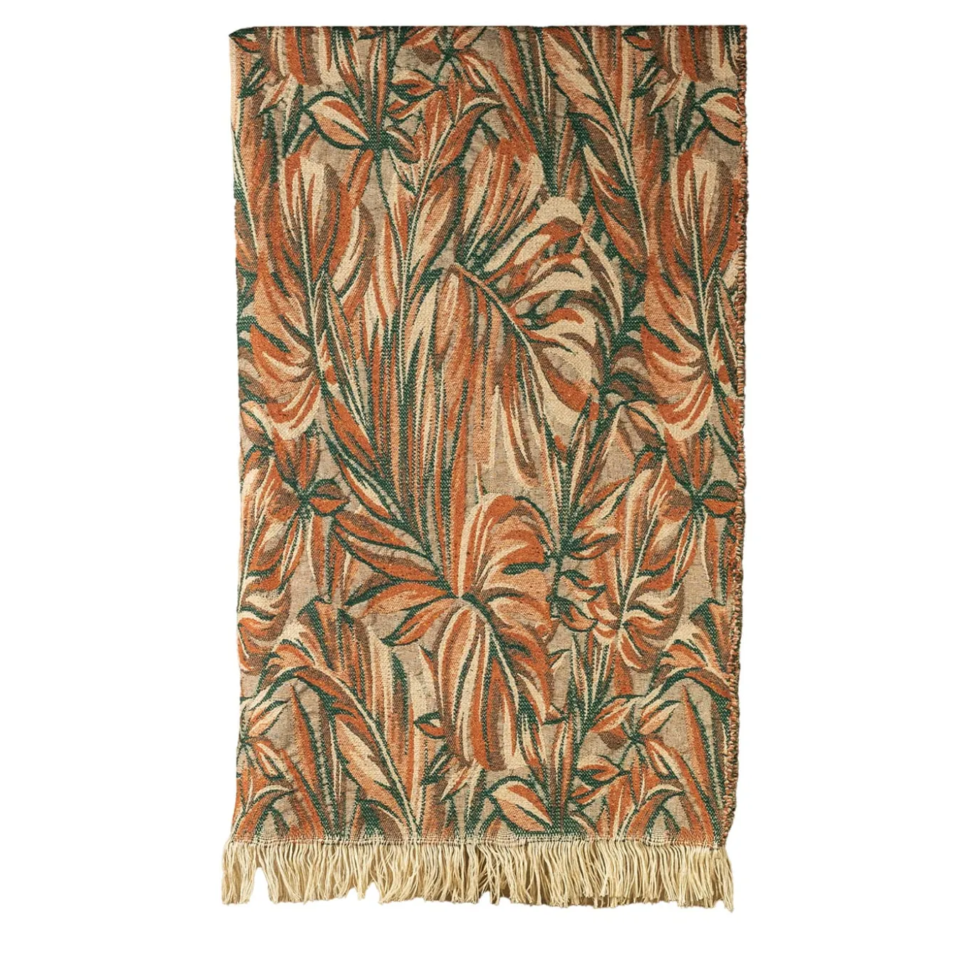 Luxuriant tropical forests come to mind when observing the rich and intricate botanical print impressed on this exquisite blanket. Offered in contrasting earthy tones, its soft weft ensures at once exceptional warmth and freshness thanks to the blend of 58% virgin wool and 27% linen, completed by a small presence (15%) of polyamide. Beige fringes seal its lively design.