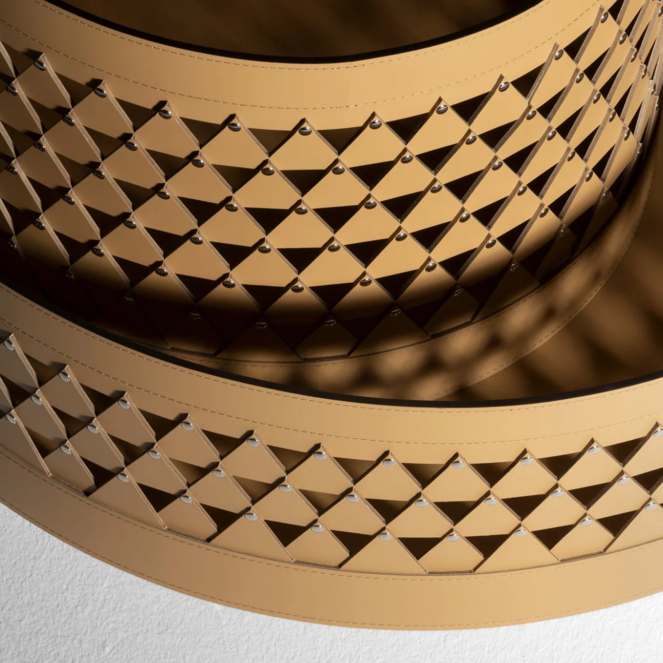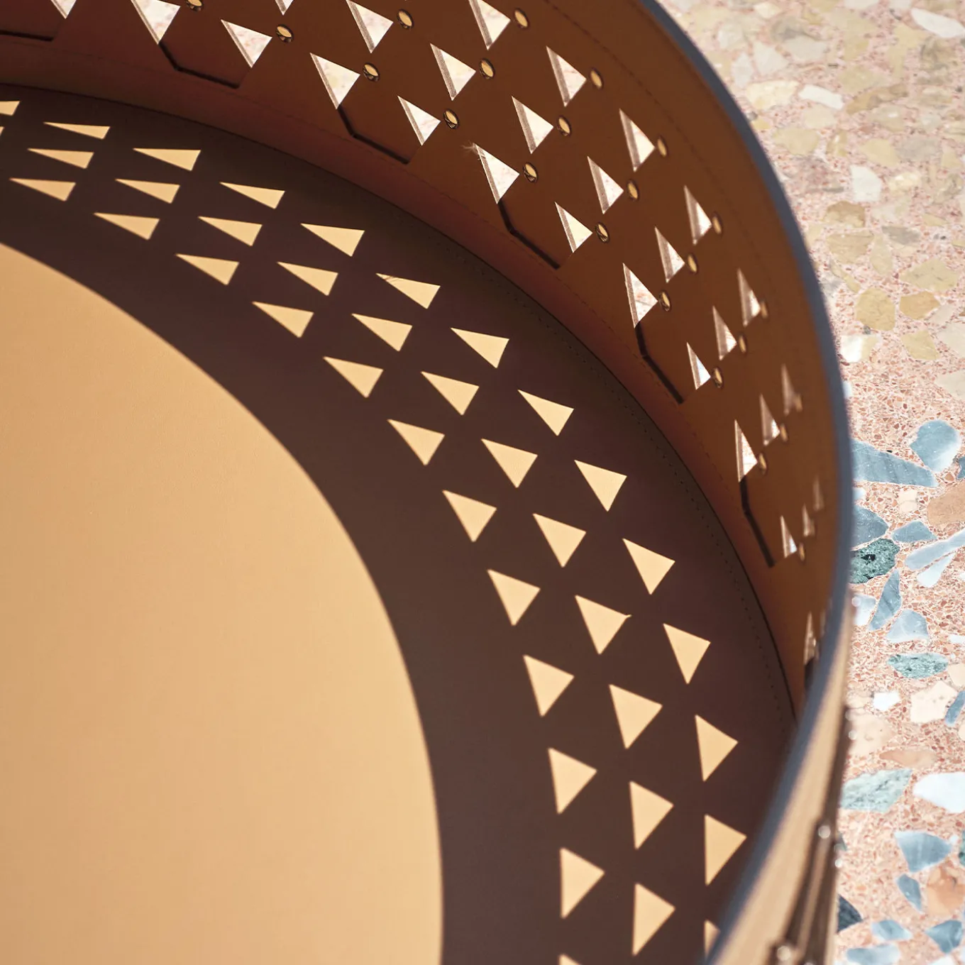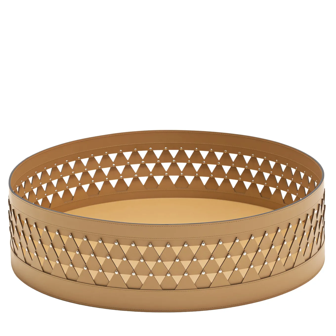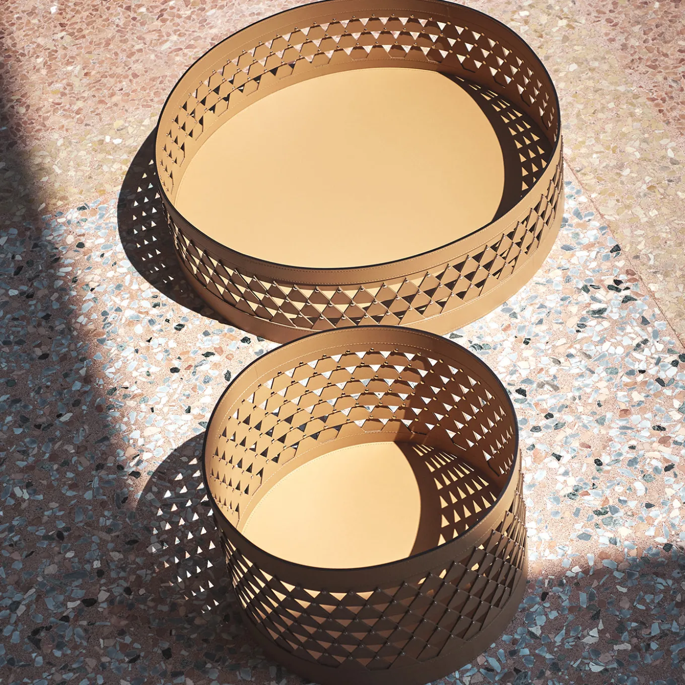 Nereide 70 round brown leather basket by STUDIOPEPE features an intricate diamond-weave structure that plays with light and shadow throughout the day. This medium-sized object brings a quiet elegance to any setting, balancing delicate craftsmanship with a structured form. Its versatile design adds a rhythmic, artisanal accent perfect for both indoor and outdoor living spaces.