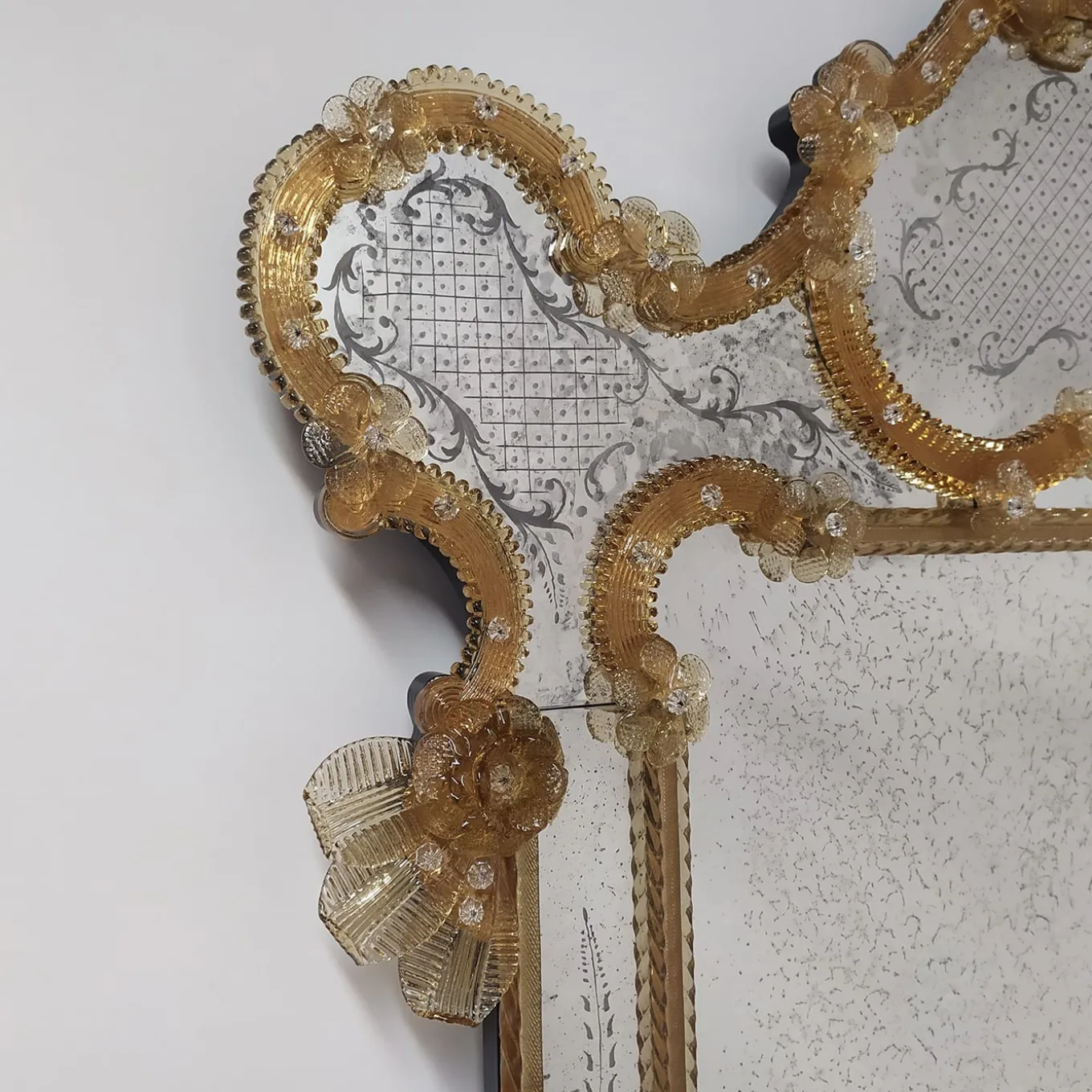 Steeped in history, this Murano glass mirror is a masterpiece of Venetian elegance. Intricate floral engravings and warm amber glass scrolls echo the charm of Venice’s lagoon landscapes, while its antique silver details enhance its timeless appeal. Handcrafted by Fratelli Tosi, this mirror is more than décor—it’s a portal to the past, inviting a touch of historic grandeur into any home, whether placed in an entryway or above an antique console.