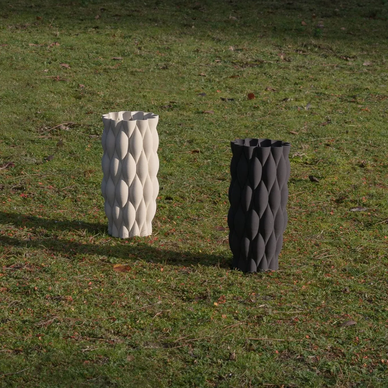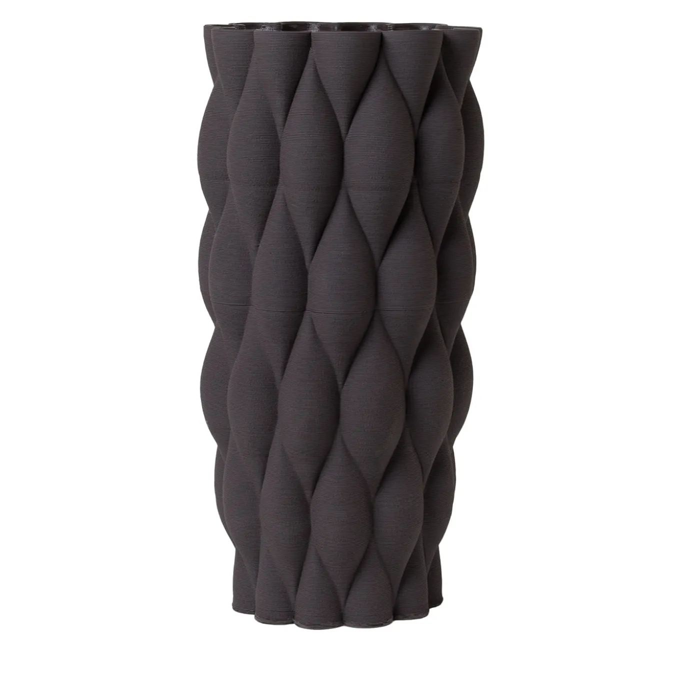 The New Delhi Black Vase is part of the Mitti Vases collection showcased at Milan Design Week Fuorisalone 2021, inspired by a journey to India. Its design reinterprets textures inspired by sand dunes, featuring an unfinished exterior with a textile-like touch that contrasts with a transparent interior glaze ensuring watertight qualities. The piece merges stoneware craftsmanship with 3D printing technology, creating unique variations in each vase that enrich its visual depth and interaction with light.