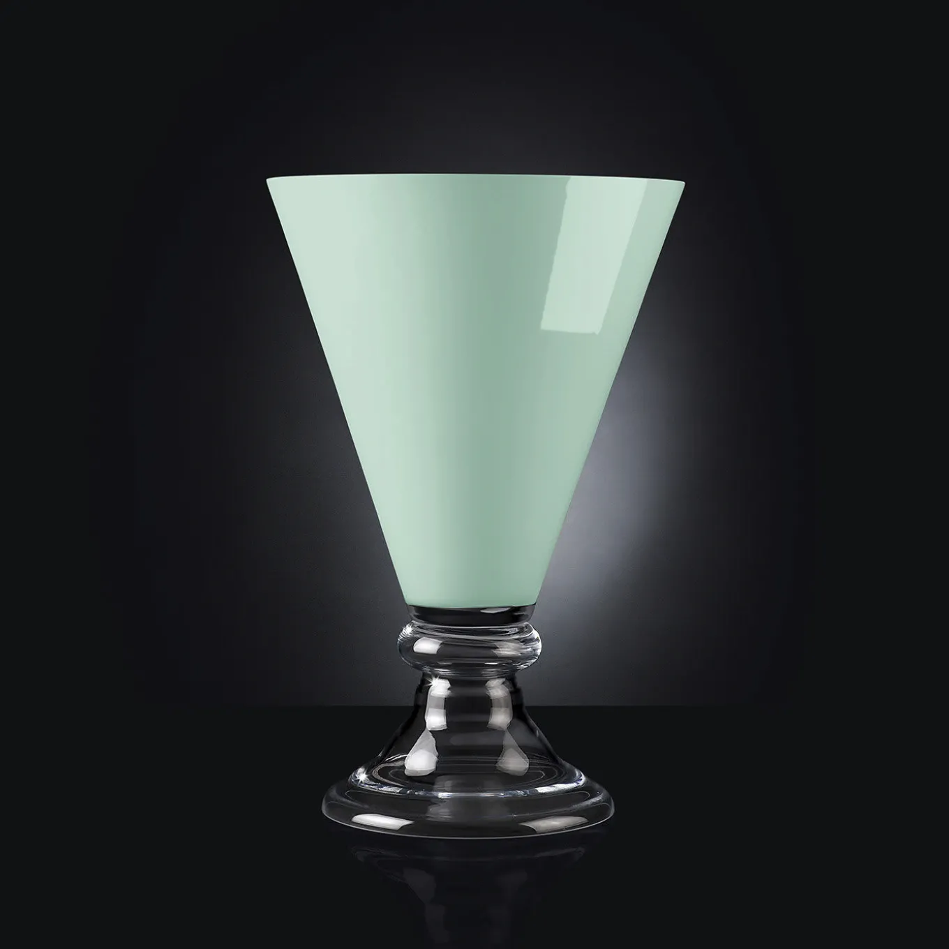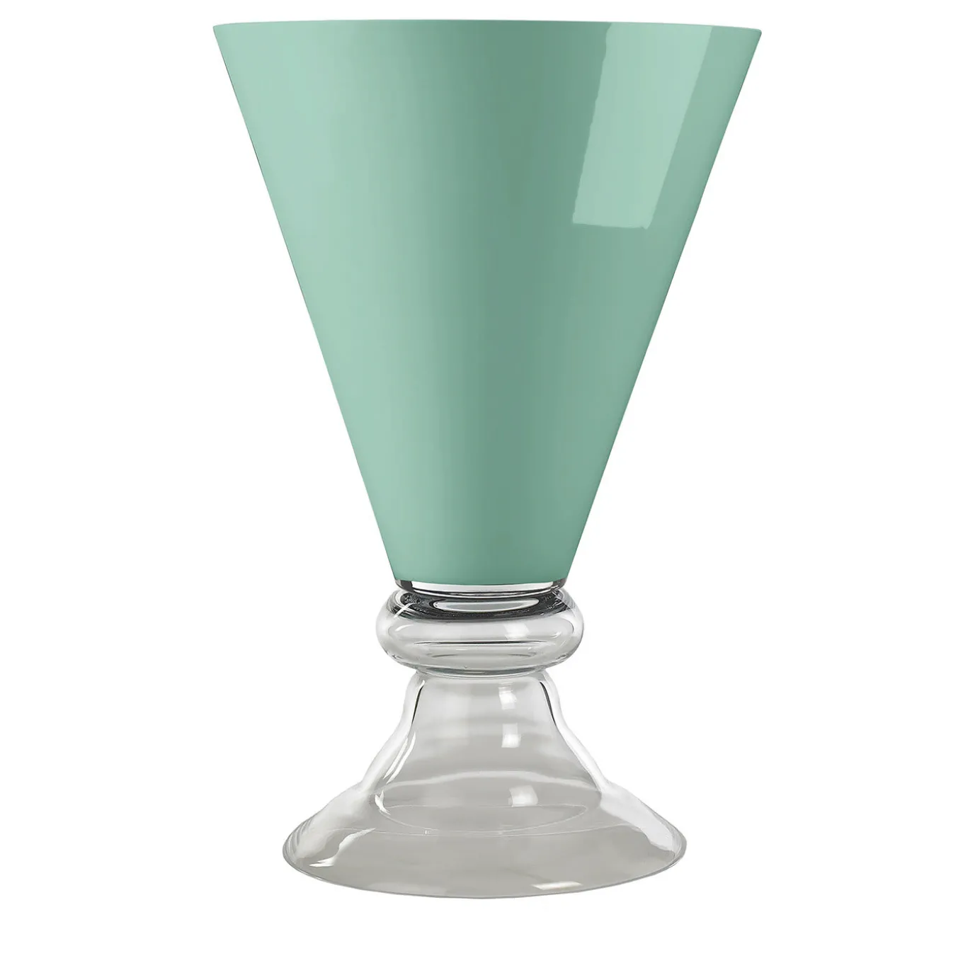 This elegant vase flaunts a timeless and versatile design that will make a statement in both a modern or classic decor, especially if paired to others from the same series. Marked by clean and essential lines, it combines a clear glass flared base with a neo-mint green flared silhouette.