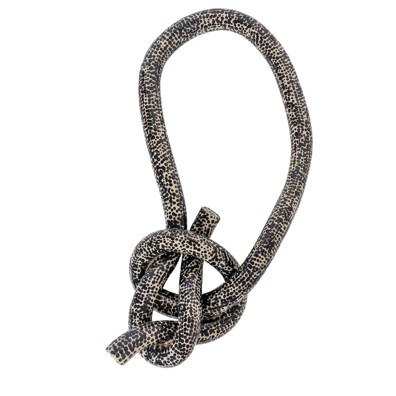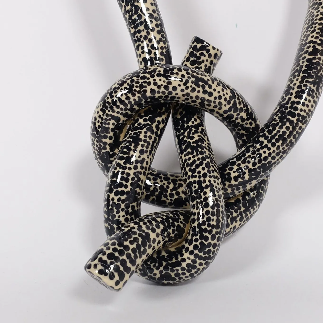 Symbolic of an unbreakable bond, of love and eternity, this knot-shaped wall decor will make for a thoughtful gift idea for a lovers’ new home. Entirely crafted by hand of porcelain stoneware, it is decorated with a spotted black pattern, enhanced with transparent enamel. Enriched with two small holes on the back, it may display small imperfections that are a testament to the vase’s uniqueness and authenticity.